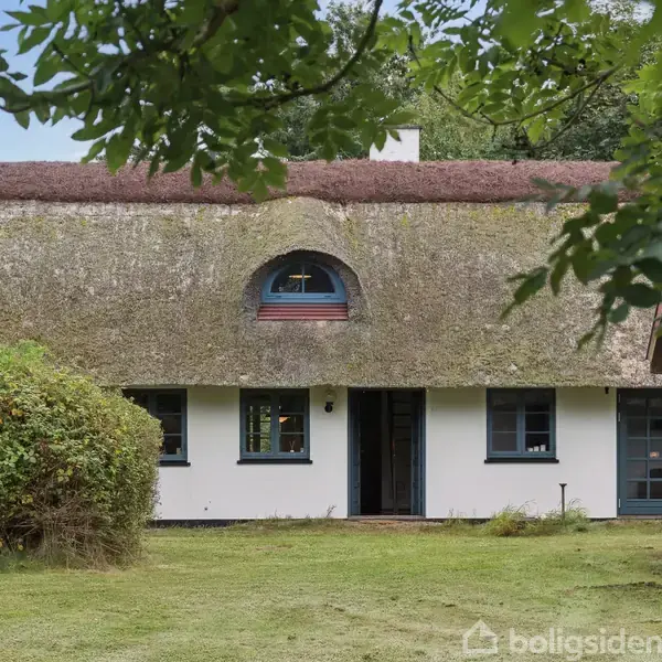 Velkommen til Strandrosevej 14 Her venter en lille oase af sommerlykke – et stråtækt fristed i fredelige Nyrup, hvor tiden går lidt langsommere, hverdagens travlhed synes langt væk, og hvor husets sjæl og varme giver plads til hele familien. Huset byder på 102 m² fordelt på to plan. Allerede fra entréen fornemmer man stemningen – med trappen, der fører op til førstesalen, hvor to lyse og rummelige værelser giver ro til både børn og gæster. Den hyggelige kvist byder på et glimt af havet og udsig
