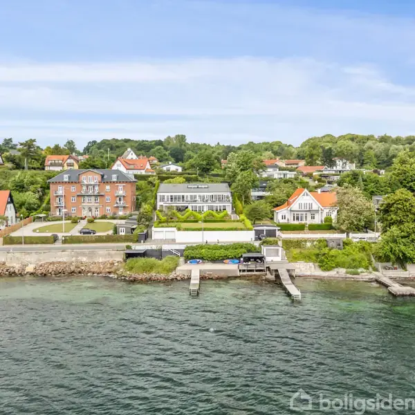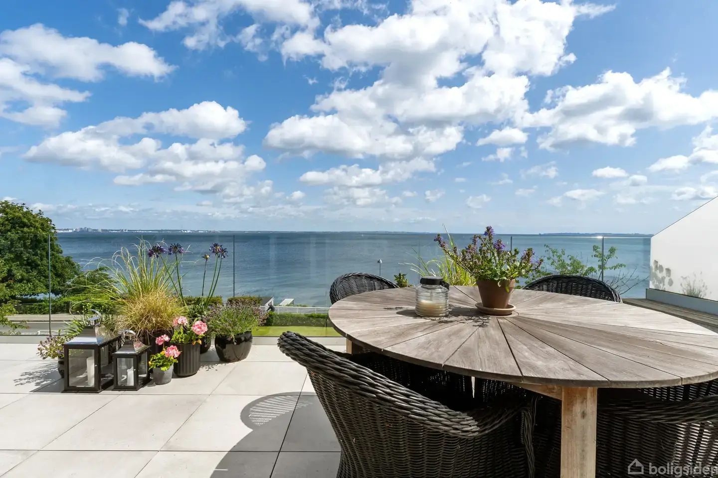 Intet er overladt til tilfældighederne i denne store futuristiske ejendom, der ligger højt ved vandet i Snekkersten og drager fordel af en betagende udsigt over Øresund. Der er tale om et halvt dobbelthus med ejerlejlighedsstatus, og beboelsesdelen rummer hele 301 kvadratmeter fordelt på to etager. Ligeledes medfølger private udemiljøer på begge sider af bygningen foruden en privat strandgrund med loungeområde og badebro. Beliggenheden i Snekkersten er både naturskøn og bekvem, da skov, vand og