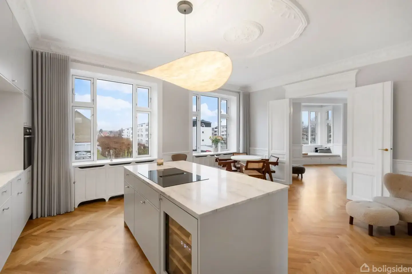 ”Jeg accepterer det store eventyr at være mig,” sagde den franske forfatter Simone de Beauvoir. Ja, manglende selvtillid kan man ikke sige, hun led af. Det samme kan man sige om de mange ejendomme på Strandvejen i Hellerup. De er bygget i den historicistiske periode, som hentede sin inspiration fra renæssancen, gotikken og barokken. Facaderne er lidt tunge, de er symmetriske med ornamenter og ses især som bypalæer. De er bygget med så stor selvtillid, at de står her endnu som et eventyr, der bare bliver ved. Skeløjet Lejligheden Strandvejen 132A er fra 1899. Med 143 m2 er den en stor lejlighed, og som hjørnelejlighed med karnap har den fordelen ved at være skeløjet: Den kan se både til højre og venstre, så den er også en lejlighed med masser af lys. Den er renoveret til en uforskammet lækker bolig med 3 gode værelser med højt til loftet, masser af skabsplads og sydvendt altan. Alt er lige til at flytte ind i. Øregårdsparken ligger lige om hjørnet, det samme gør stranden, de hyggelige sundveje til Øresund, de smukke tennisbaner, havnen, standen, strandpark, caféerne, restauranterne og de lækre butikker på strandvejsstrøget. Hellerup Hellerup er den første by ud af København mod Nordsjælland. Ja, fra Hellerup er der ikke langt til al balladen i København. Måske derfor tidligere tiders velhavere ofte valgte Hellerup, når de med mursten, håndværk, plads og højt til loftet ville sig selv, deres samtid og eftertid noget. De smukke ejendomme, palæerne, de markante bygninger, de er stadig populære. Sikkert er det, at der ikke kommer flere bypalæer i vores levetid med en historie, der er over 125 år gammel.