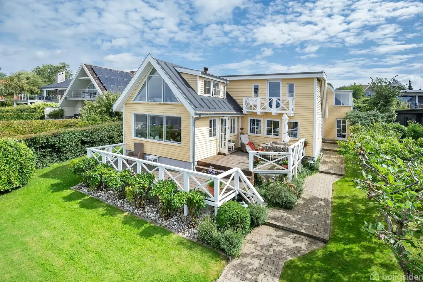 Åbent hus med tilmeldingskrav 1/2 - klik på billede - Der findes steder, hvor tiden føles langsommere, lyset blødere og livet lettere. Strandvejen 5 er ét af dem. Her, i 2. række til Roskilde Fjord, lever du med en udsigt, der hver dag maler himlen i nye farver - fra det første gyldne morgenstrejf til solnedgangens stille glød. Det charmerende, gule træhus står som et romantisk vartegn for den gode tilværelse. Indenfor mødes du af lyse, venlige rum, hvor køkken og spiseafdeling samler hverdagens små og store øjeblikke, mens stuen åbner sig mod terrassen og haven - et perfekt sted til lange sommeraftener med udsigt over vandet. Et gæstetoilet og et praktisk bryggers fuldender stueplan. På førstesalen finder du en hyggelig opholdsstue med kig til fjorden, et lyst badeværelse og et stort, fredeligt soveværelse, hvor morgensolen blidt vækker dig. Kælderen rummer et ekstra fyrrum, ideelt til familiens praktiske behov. Ejendommen byder også på et boliggodkendt selvstændigt anneks i to plan. Her er stue, badeværelse og et soveværelse - oplagt som gæstehus, atelier eller privat fristed for teenagerne. Ved vejen er her en rummelig garage som kan bruges til biler eller hobby. Som en del af grundejerforeningen får du adgang til et privat strandstykke med badebro. Herfra er vandet altid tæt på - til en frisk morgendukkert, en rolig aftensvømmetur eller en stille stund, hvor bølgernes klukken bliver dagens musik. Og selvom roen hersker her, er du kun få minutter fra dagligvarehandel, offentlig transport, skoler og lystbådehavnen. Strandvejen 5 er ikke bare en bolig - det er et sted, hvor du lever tættere på naturen, på vandet og på drømmen. Jyllinge byder på så meget. Sommeren bliver lidt dejligere, når alle de skønne aktiviteter og lange løbe- og gåture kan nydes ved Roskilde Fjord. Bådlivet omkring havnene er helt unikt og børnene kan du trygt lade opvokse i det børnepopulære Jyllinge. Med kun 30 km. til København og 15 km. til Roskilde er Jyllinge særdeles attraktivt beliggende ved Roskilde Fjord. I starten af 1900-tallet søgte mange kunstmalere til Jyllinge, tiltrukket af det særlige lys og de mange smukke motiver langs med fjorden, og byen var på det tidspunkt kendt som et "Lille Skagen". I dag er der lidt mere end 10.000 indbyggere i Jyllinge, vi har 2 store skoler, mange daginstitutioner, 2 lystbådehavne og en gammel jollefiskerihavn. Idrætsfaciliteter med bl.a. idrætshal, stor oplyst kunststof-fodboldbane samt svømmehal. I Jyllinge Centret findes der alle de indkøbsmuligheder, som du har behov for i dagligdagen.
