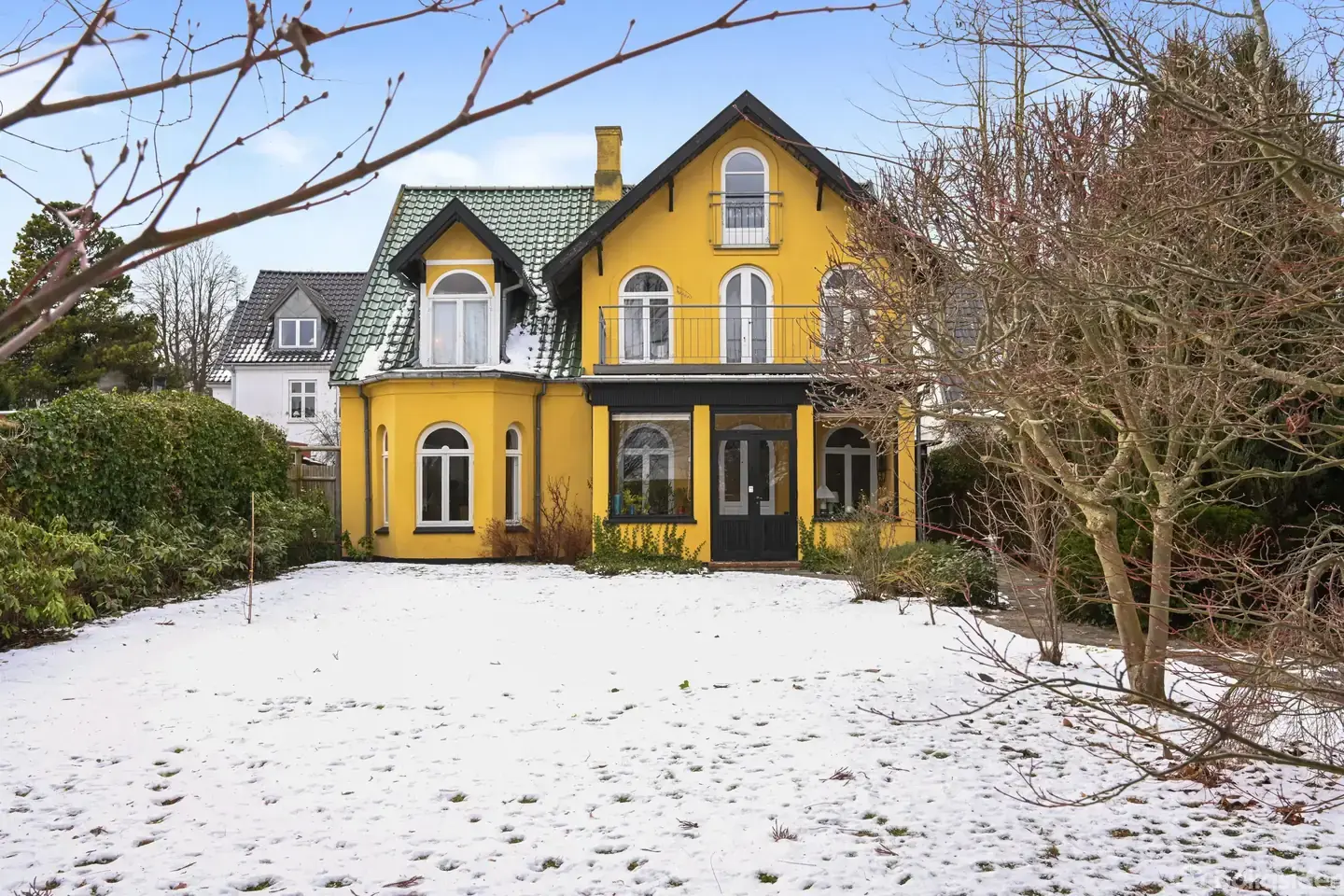 Taarbæk-villa med udsigt til Øresund Markant patriciervilla med victoriansk strejf – tilbagetrukket beliggenhed med udsigt til ØresundSmuk og karakterfuld patriciervilla med victoriansk præg og elegante, buede vinduer. Ejendommen er beliggende tilbagetrukket fra Strandvejen og byder på gode parkeringsforhold på egen grund.Villaen fremstår med pudsede facader, tegltag fra 2009 samt renoverede og delvist udskiftede vinduer og træværk i perioden 2009–2014.Stueplan indeholder vindfang/entré med ska