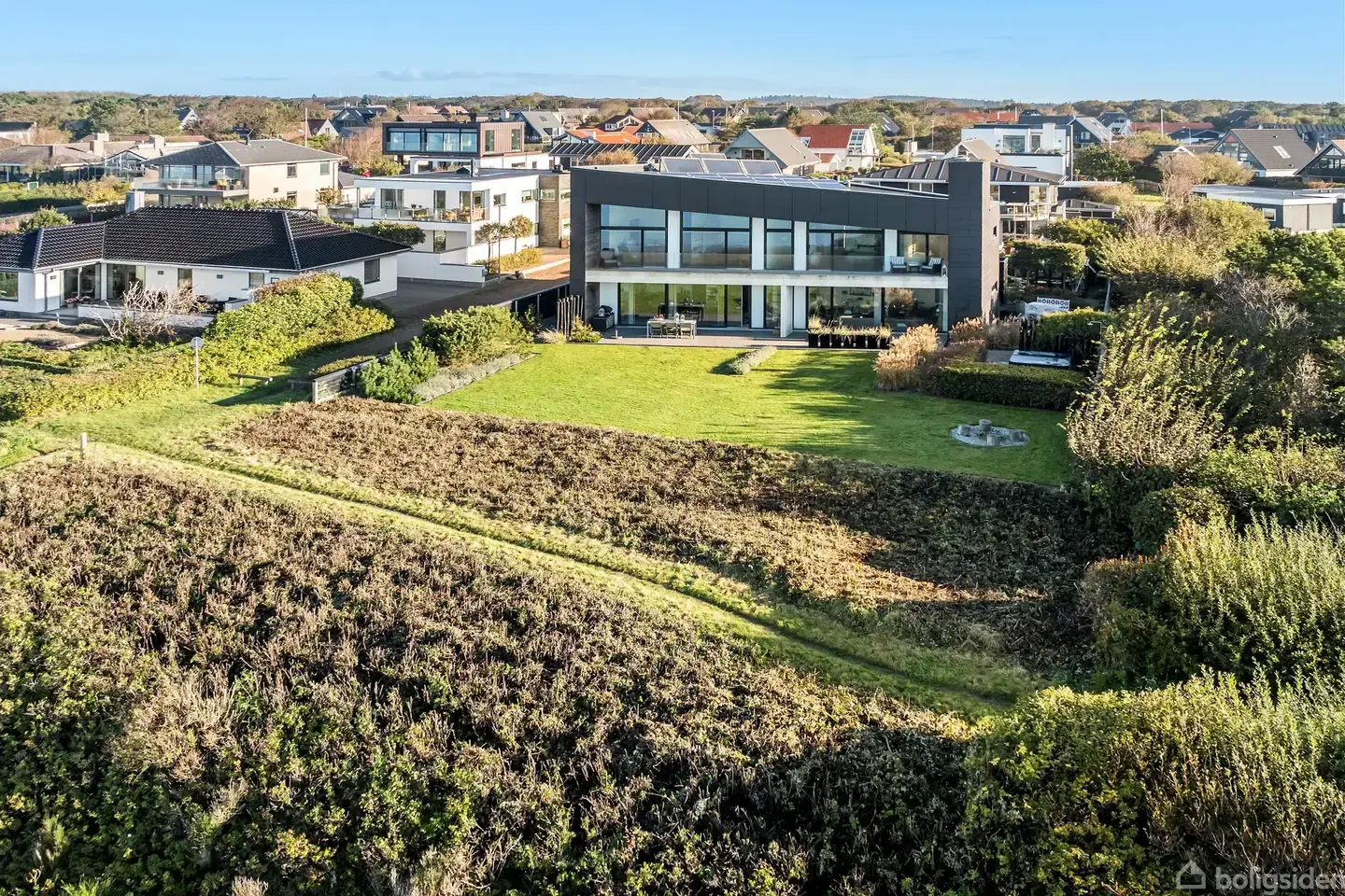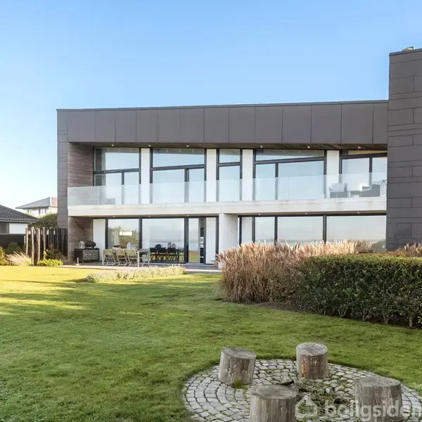 Denne arkitekttegnede villa er i særklasse et eksempel på en villa, der henvender sig til den kræsne livsnyder med udpræget sans for kvalitet og æstetik. Her får du hele 443 luksuriøse, højloftede kvadratmeter under tag med en af byens absolut bedste beliggenheder i første række til Ho Bugt. Hjerting er den mest eftertragtede del af Esbjerg, og selvom mange af husene har en god udsigt, er det kun meget få, der ikke også skal forholde sig til Strandvejens trafik. Villaen her ligger helt nede for enden af en lukket vej, og hvor grunden slutter, afløses den af storslået natur. Stregerne til villaen er sat af den prisvindende tegnestue C.F. Møller, som er én af landets førende. Arkitekturen følger nordiske traditioner med fokus på funktionalitet og stringente, minimalistiske linjer. En asymmetrisk bygningskrop med ensidet taghældning er udgangspunktet for en spændende indretning inden døre, og mod sydvest åbner facaden sig op ud mod vandet med glaspartier, der fylder stort set hele facaden. Derfor er der også en fuldstændig uforstyrret udsigt over bugten i alle husets bolig-etager. Villaen er opført som passiv-hus og har energimærke A2020 takket være solceller, jordvarme og varmegenvindingsanlæg. Indvendigt spiller de store glaspartier også hovedrollen, for sammen med udsigten, giver de også et helt unikt lys, der ændrer sig i takt med vejret udenfor. Huset er indrettet med gennemgående materialer af topkvalitet, der fører rene linjer hele vejen igennem boligen. Det være sig blandt andet knasfugede marmorgulve, der afløses af smukke plankegulve i massivt egetræ og ikke mindst interiør fra Uno form overalt. Hvidevarerne er af highend-mærker som Gaggenau og Miele, mens alle armaturer er fra VOLA. Stueplan byder på en store stue med pejs i åben forbindelse til et køkkenalrum. Dernæst er der en entré med gæstetoilet og skabsgang/garderobe. 1. sal byder på den mest fantastiske forældreafdeling indeholdende, stort badeværelse med fritstående badekar, stort soveværelse med fantastisk udsigt samt stort walk-in closet. Derudover er her tre store værelser, med fantastisk loftshøjde og igen panorama udsigt fra de to mod vandet. Til værelserne er der ligeledes stort og eksklusivt badeværelse. Fra soveværelse og de to af værelserne er der direkte udgang til en lang svalegang med udsigt over vandet, hvor man er total ugenert fra alt omkring sig. Endelig er der underetagen, som tilføjer 133 m2, der hvad angår både stil og kvalitet er fuldt ud på højde med resten. Etagen er inddelt i to disponible rum, et stort klimakontrolleret vinrum samt et bryggers og yderligere badeværelse, så etagen kan fungere som gæstelejlighed. Haven er en naturlig udvidelse af boligen og er anlagt med den samme luksuriøse enkelthed. Foruden den primære terrasse med udgang fra stueplan, er her en sektion med Jacuzzi og rainshower med koldt og varmt vand, og derudover er der en bålplads samt flere hyggekroge og mindre terrasser. Oplev et liv i første række. Bestil en fremvisning hos EDC.