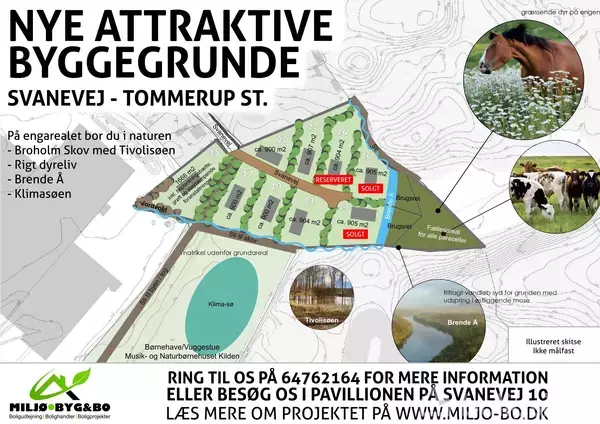 Unikke byggegrunde, tæt på naturen Udstykning med ialt 9 byggegrunde i denne skønne oase - centralt beliggende - men samtidig tæt på naturen. Med kort afstand til både indkøb, institutioner, skole og offentlig transport og samtidig med have lige ud til skoven, så får du her en helt unik mulighed. For enden af Svanevej centralt i Tommerup Stationsby ligger et uforstyrret engareal med Broholm Skov som nærmeste nabo. Her er nu udstykket 9 fantastiske byggegrunde som er klar til bebyggelse.. I den u