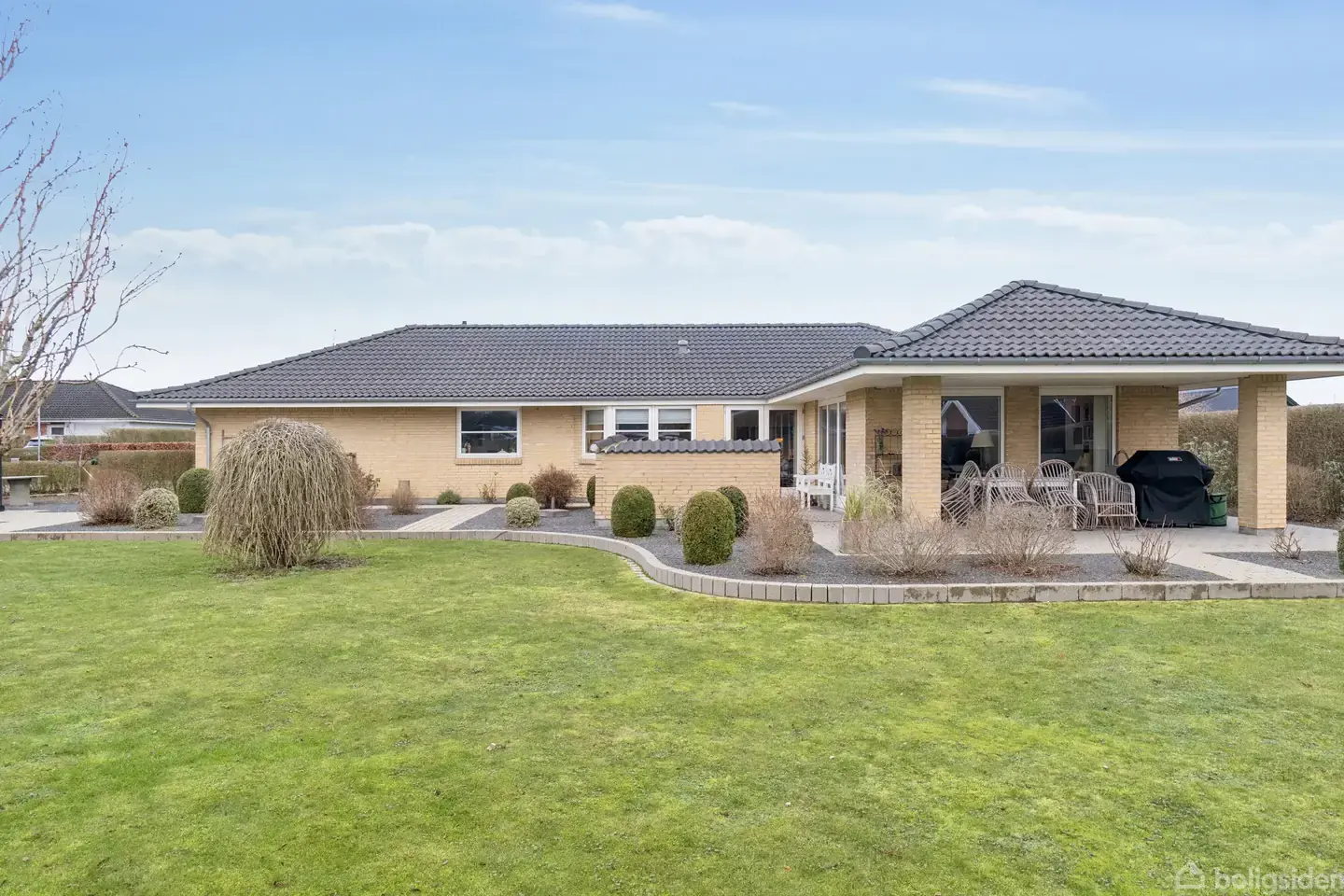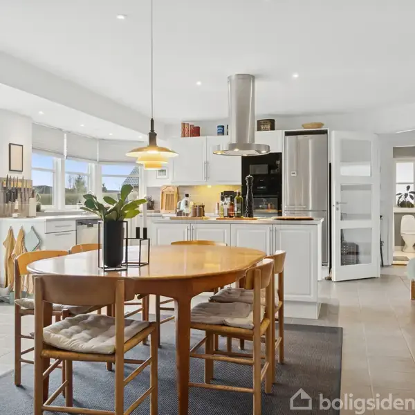 Indstil eftersøgningen! Her er noget for familien Det praktiske er på plads. Der er en separat forældreafdeling. I får yderligere tre værelser, I har plads til at samles i de lækre opholdsmiljøer, og så er der gulvvarme overalt. Varmepumpen, varmepumpe på ventilationsanlæg, er fra 2025. Så kommer det til stemningen, og dén kan I heldigvis også se frem til. Lysindfaldet kaster et varmt og åbent skær over indretningen, og med de mange terrassedøre er der yderligere en herlig harmoni mellem ude o