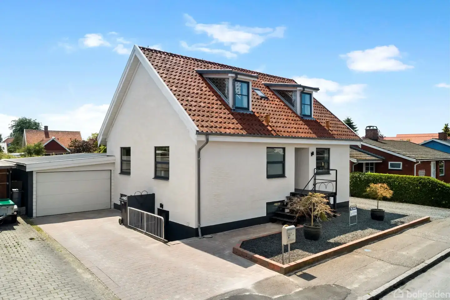 Indflytningsklar og flot moderniseret villa på ialt 210 kvm, i roligt & eftertragtet kvarter på Østerbro – tæt på alt ! Velkommen til Sverigesvej 24 – en gennemrenoveret og indflytningsklar vandskuret murstens villa på 133 kvm beboelse samt med 77 kvm dejlig kælder, alt med pænt rødt tegltag, og beliggende på sydvendt grund i et roligt og særdeles attraktivt område på Østerbro i Nykøbing F. Her bor du tæt på skole, indkøb, daginstitutioner og naturskønne omgivelser ved Sundet. Ejendommen er løbende moderniseret igennem de seneste 24 år og fremstår i særdeles flot stand med bl.a. flotte gulve, nyere vinduer og døre (træ/alu) fra ca. 2019, nyere trappe til 1 sal og stilrent køkken fra 2021 fra Nettoline med alle nyere hårde hvidevarer. Stueplan byder på en lys og indbydende entré med adgang til badeværelse med brus, toilet og håndvask. Den store vinkelstue fungerer både som opholds- og spisestue, og rummer mulighed for etablering af et ekstra værelse. I åben forbindelse ligger det nye lækre grålige køkken med god skabsplads, flot bordplade og en central kogeø med karakteristisk ufoformet emhætte. Fra bagindgangen er der udgang til haven via en fin klinkebelagt veranda. Stueplanet er udstyret med nyere gulve og behagelig gulvvarme mange steder. 1. sal rummer et repos, soveværelse og to værelser – alle med loft til kip og synlige bjælker samt vedligeholdelsesfri kviste i zink. Der er ligeledes toilet med håndvask og pæne trægulve overalt. Et genvex-anlæg sikrer et godt og sundt indeklima. Kælderen som er flisebelagt er fuldt brugbar og indeholder et stort vaskerum med installation til vaskemaskine og tørretumbler samt egen opgang til indkørsel. Derudover finder du en stor gildestue med bar, et ekstra værelse, teknikrum og et helt nyt, rummeligt badeværelse med fliser, toilet og håndvask. Kælderen har også gulvvarme ifølge sælgerne næsten overalt. Ejendommen er energivenlig med god isolering - se fint Energimærke, nyere undertag og spær (2003) under det originale genoplagte tegltag. Fibernet indlagt. Villaen fremtræder med lyse farver, pæne gulve, nyere hvide døre. Til huset hører desuden en god stor garage med automatisk port og skydelåger til haven, overdækket terrasse, drivhus, stort værksted og en nem sydvendt have – perfekt til både børn, afslapning og hobbyliv. Vil du bo centralt, men fredeligt – i en bolig hvor alt det store arbejde allerede er gjort ? - Så er Sverigesvej 24 et oplagt valg ! Kontakt os for en fremvisning – vi glæder os til at vise dig denne skønne bolig.