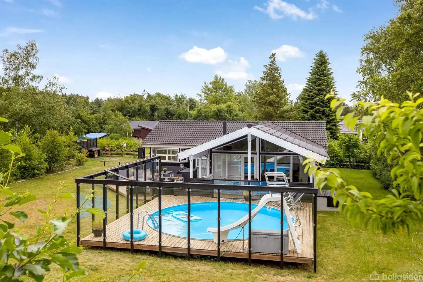 Åbent hus med tilmeldingskrav 2/2 - klik på billede - Moderne sommerhus med udendørspool STORT UDLEJNINGSPOTENTIALE: sælger har udlejet sommerhuset igennem bureau i højsæson(åben for udlejning i 10 uger årligt) med realiseret indtægt på 98.000 kr. i 2025 På en attraktiv beliggenhed tæt på Hals by og strand udbyder vi nu dette ekstremt velholdte og indflytningsklare sommerhus, opført i 2011 med 98 m² veludnyttede boligkvadratmeter. Her er der tale om et moderne og gennemført fritidshus, hvor både komfort, kvalitet og æstetik går op i en højere enhed. Huset byder på loft til kip og store vinduespartier, som sikrer et fantastisk lysindfald og en luftig atmosfære. Det moderne og rummelige køkken fremstår stilrent med mørke fronter, der står flot i kontrast til husets lyse træbeklædning. En elegant vindueskarnap giver ekstra lys og skaber en indbydende ramme om madlavningen. I forlængelse af køkkenet er en rummelig spisestue. Opholdsstuen er hyggelig og indbydende med brændeovn og udgang til den store overdækkede terrasse. Fra køkken og opholdsrum er der naturlig sammenhæng til resten af huset med minimalt spildplads. Der er tre gode værelser samt en hems, som giver ekstra sove- eller opholdsplads. Badeværelset er stort og velindrettet med spabad, rummelig bruseniche og infrarød sauna – perfekt til afslapning året rundt. Entréen har praktisk plads til overtøj og fodtøj. Udendørs venter en stor træterrasse mod syd og vest med både åbne og overdækkede arealer, så solen kan nydes fra middag til aften. Smukt integreret i terrassen er den udendørs swimmingpool, som indbyder til sommerhygge og afslapning. Haven er privat, solrig og velanlagt med en flot nedsænket terrasse. Det er en tør grund uden udfordringer med højt grundvand.