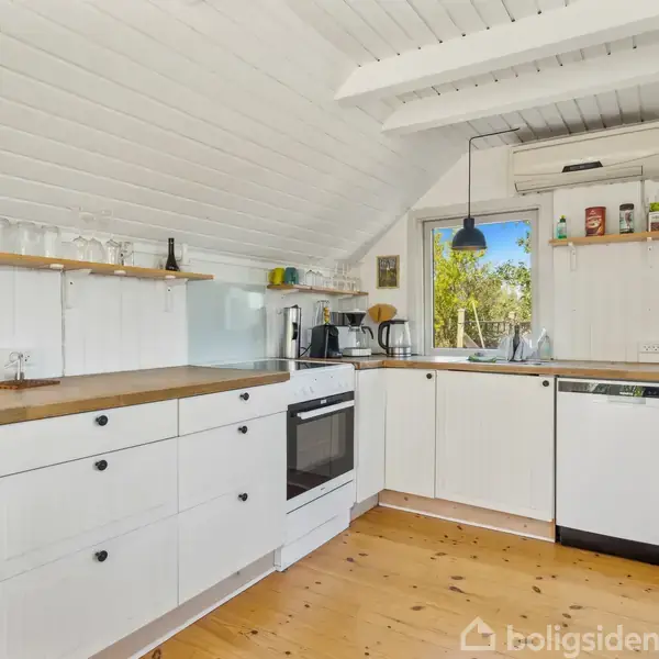 Nu kan I du overtage nøglerne til et fritidshus, som har en helt særlig beliggenhed. Her på Svinget ligger du nemlig lige ud til Randers Fjord, og dette fritidshus har en af de bedste placeringer. Du får nemlig udsigt til åbent vand fra terrasser, have og vildmarksbad, hvor du kan nyde lyset over vandet og følge med, når skibene langsomt sejler forbi. Fritidshuset består af to separate afdelinger, som tilsammen giver 48 boligkvadratmeter. Den ene afdeling har stue og køkken i ét, mens den anden