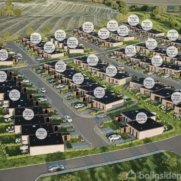 Åbent hus med tilmeldingskrav 14/12 - klik på billede - Velkommen til Langkær Bakke – en ny udstykning beliggende i Ugelbølle på Syddjurs. Projektet omfatter 80 etplansrækkehuse, som både udbydes som ejerboliger og lejeboliger. Boligerne er beliggende på skråning med smuk udsigt til Kalø Vig og Mols Bjerge. Der opføres fem forskellige boligtyper med størrelser fra 88-114 kvm. Salgspriserne starter fra 2.245.000 kr. Ugelbølle er en charmerende by, attraktivt beliggende tæt på både skov og strand. Den har nem adgang til offentlig transport og der er kort afstand til E45, hvilket gør det let at komme til de omkringliggende større byer som Aarhus og Ebeltoft. Byen er omkranset af smuk natur, grønne marker og skove, der inviterer til udendørs aktiviteter. Den tætte beliggenhed ved Djurslands kyst giver mulighed for at nyde strandlivet. Der er flere vandre- og cykelruter i området, som tilbyder unikke naturoplevelser. Den korte afstand til Mols Bjerge Nationalpark åbner også op for spændende ture i et af Danmarks mest spektakulære naturområder. Ugelbølle har et stærkt fællesskab og et livligt foreningsliv, der står bag en række kulturelle og sociale begivenheder. Ugelbølle er et fremragende valg for familier med børn. Byen har skole og gode daginstitutioner, som giver de yngste beboere en tryg opvækst. I den nærliggende by Rønde findes flere supermarkeder. Læs mere om projektet på "www.langkaer-bakke.dk"