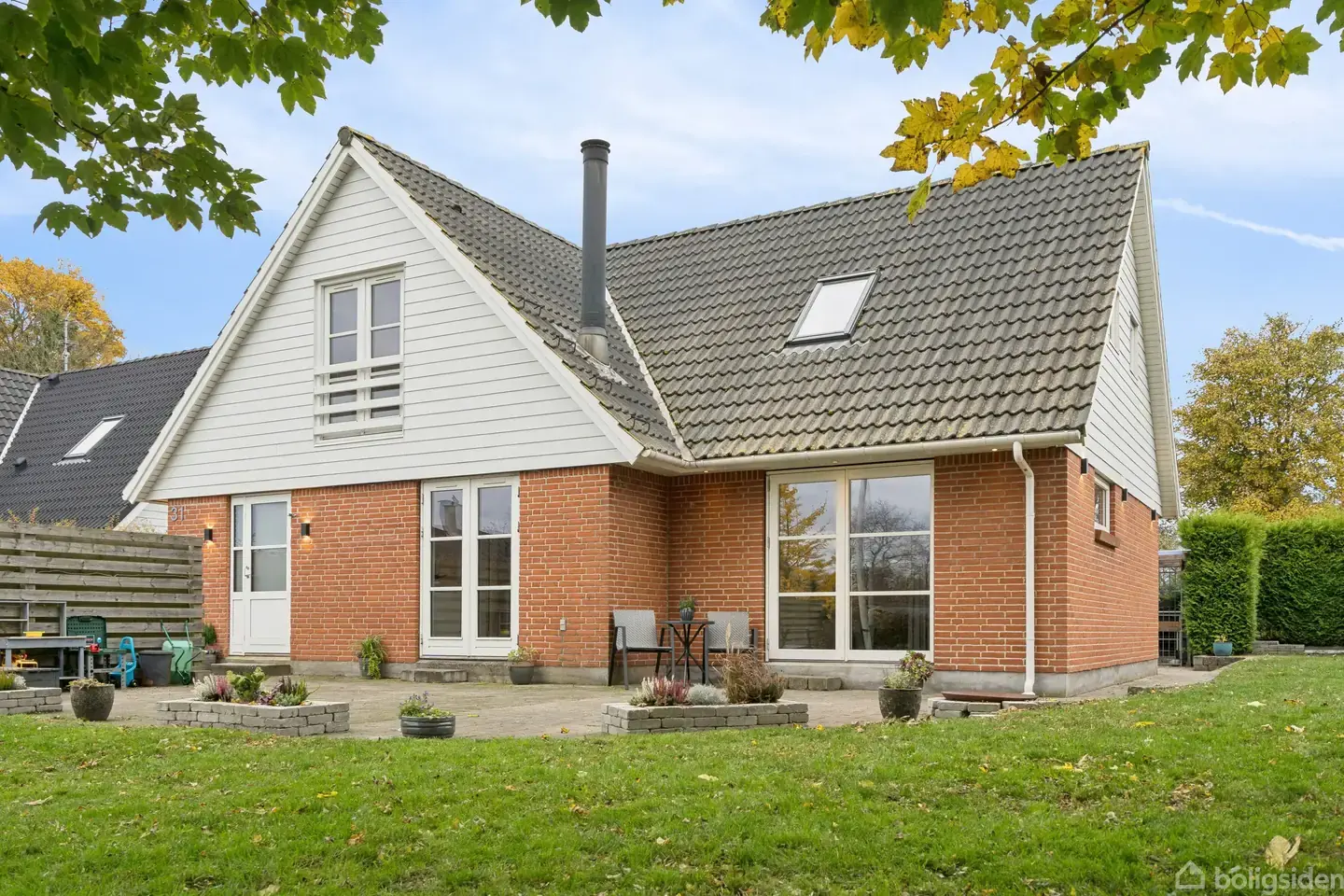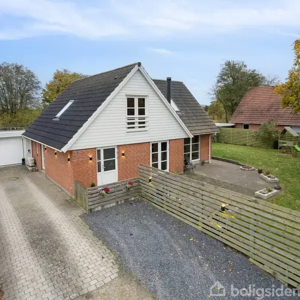 Velholdt 165 m² villa med 4 værelser, integreret garage og stor terrasse Villa på 165 m² med 4 soveværelser og 710 m² grund i et roligt kvarter nær natur og kommunen. Her får I et hjem fra 1990 med klassiske detaljer og en funktionel indretning, hvor pladsen er udnyttet optimalt til familiens behov. Den velholdte facade kombinerer røde mursten med hvide trædetaljer og bidrager til det tidløse udtryk. Indkørslen fører direkte op til en integreret garage, der giver sikker parkering. Hjemmet byder