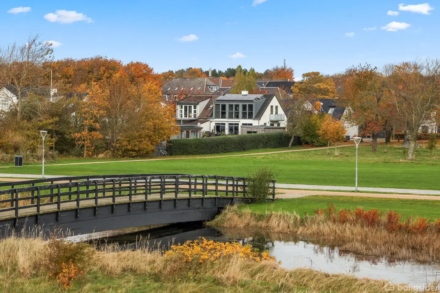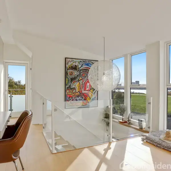 Velkommen til Thistedvej 26 - en arkitekttegnet villa med en enestående beliggenhed ved fjorden. Her får du en helt unik placering med have direkte ned til Lindholm Strandpark og en panoramaudsigt over både fjorden, de grønne arealer og byens skyline. Huset ligger tilbagetrukket fra vejen, så du får en rolig og privat atmosfære, samtidig med at du har kort afstand til alt, hvad du behøver i hverdagen. Skole, daginstitutioner, indkøb og offentlig transport ligger tæt på, og både Nørresundby og Aa