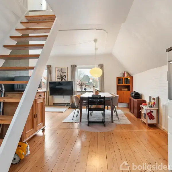 Indretning: Hjemlig hygge og masser af muligheder Når du træder ind på Thorkildsgade 38, 1. sal, rammes du med det samme af en helt særlig følelse: Her føler man sig bare hjemme. Boligen emmer af sjæl og er perfekt indrettet til dig, der ønsker både fællesskab og privatliv. Turen starter i entréen, hvor du på højre hånd finder det første soveværelse. Her kan du vågne op til et hyggeligt, grønt kig ud til haven – en rolig start på dagen. Lige ved siden af værelset ligger badeværelset, der er opda