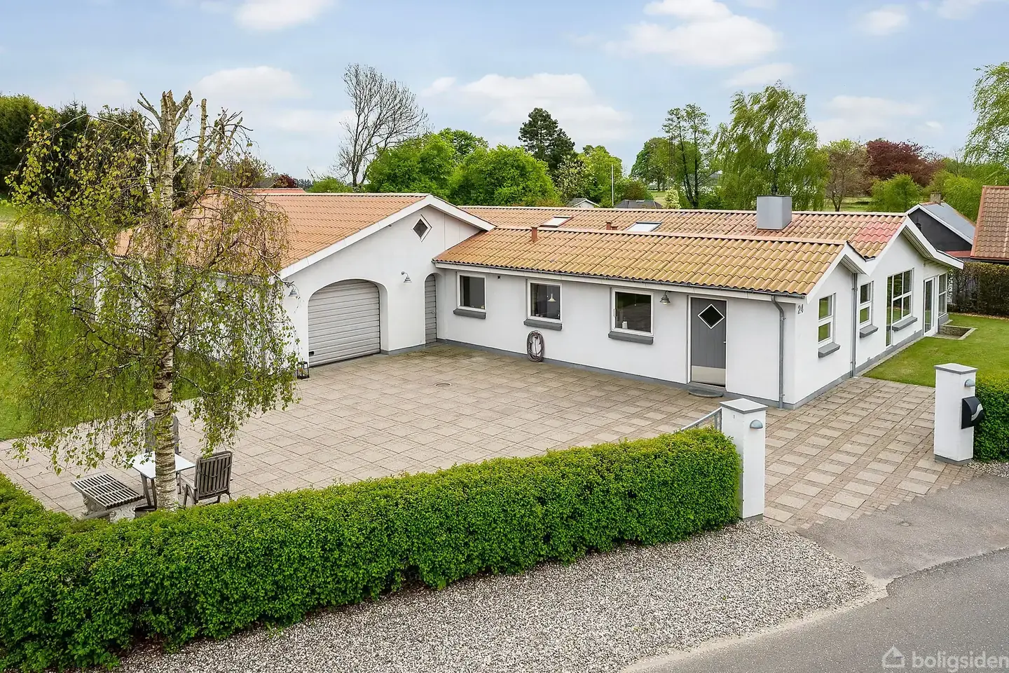 Velkommen til denne skønne villa, der byder på et boligareal på hele 161 kvadratmeter og hele 94m2 garage og en stor grund med masser af muligheder. Ved ankomsten træder du ind i en lys entré med bryggers i forlængelse, hvor praktiske løsninger som vask og rigelig skabsplads gør hverdagen nemmere. Husets hjerte er det åbne køkken-alrum, der elegant smelter sammen med stuen og spisestuen. Her finder du en central placeret brændeovn, som spreder varme og hygge til hele leverummet. Fra stuen kan du bevæge dig ud i den dejlige udestue, hvor store vinduespartier sikrer et fantastisk lysindfald året rundt. Badeværelset er en oase af velvære med sit store ovenlysvindue, brus samt badekar – ideelt til afslapning efter en lang dag. Derudover har huset også et gæstetoilet for ekstra bekvemmelighed. Med tre værelser plus et stort soveværelse med direkte adgang til terrassen får familien masser af plads at udfolde sig på. En gang/multirum fungerer som ekstra gode kvadratmeter, ideelt som legeområde for børnene. Udenfor venter en flot vedligeholdt have samt flere terrassemiljøer perfekte til sommerens grillfester. I forlængelse af haven har man et stor grund, hvor der er plads til evt. dyrehold. Den store garage er fantastisk og rummer muligheder for hobbyværksted og har integreret ATV-lift. Ejendommen ligger nær Gadbjergs skole og indkøbsmuligheder samt blot små ti minutters kørsel fra Jelling, kendt for sit rige kulturliv. Dette hjem er den perfekte ramme for familielivet med masser af plads både inde og ude. Den store grund giver rig mulighed for leg, afslapning og hyggelige stunder under åben himmel – og der er også mulighed for at holde dyr, hvis drømmen er et liv tættere på naturen. Den rummelige garage med integreret værksted er ideel til både hobbyprojekter og praktiske gøremål. Her får I ikke bare et hus – men et sted, hvor familien kan trives i mange år frem.