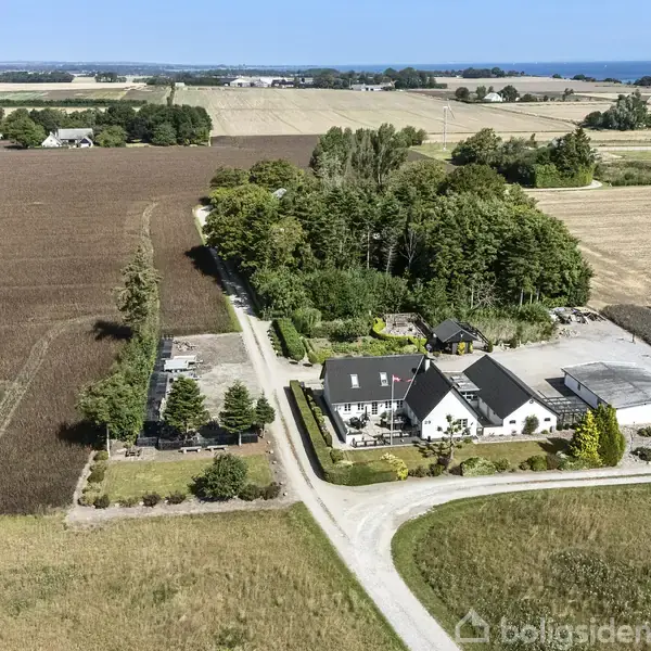 I idylliske omgivelser kun få hundrede meter fra Hølken Strand og tæt på alle faciliteterne i havnebyen Hou finder I denne spændende ejendom, der ligger meget fredeligt og med en flot udsigt over Aarhus Bugt. Til ejendommen hører et stort, dejligt jordstykke på omkring tre hektar, hvor I blandt andet har direkte adgang til vandet via en tinglyst markvej, så I kan nyde svale morgen- og aftendukkerter året rundt. Ejendommen ligger godt tilbagetrukket fra vejen for enden af en allé, hvilket giver
