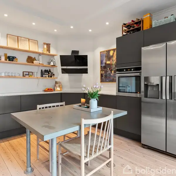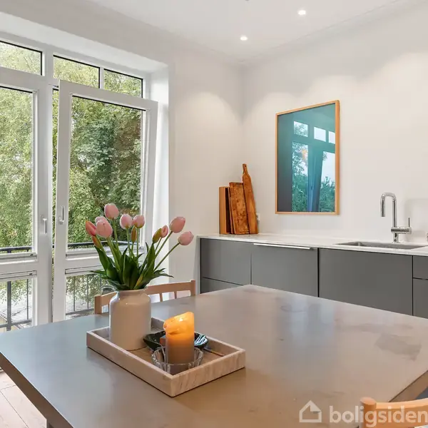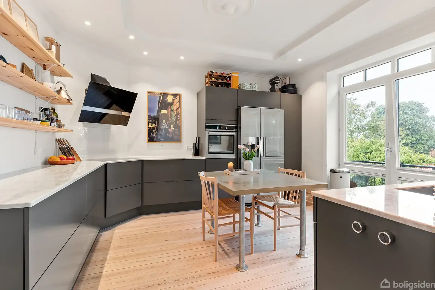 Allerede ved ankomsten til denne lejlighed på ca. 164 etagemeter mærker man straks den unikke atmosfære, hvor klassisk herskabelighed og moderne komfort spiller smukt sammen. Den præsentable ejendom i røde sten med mansardtag i tegl danner en elegant ramme om området, og indgangen byder varmt velkommen med løftet om kvalitet, æstetik og en boligoplevelse ud over det sædvanlige. Her er du omgivet af elegante detaljer som høje paneler, stuklofter og velholdte gulve—og helhedsindtrykket er harmonis