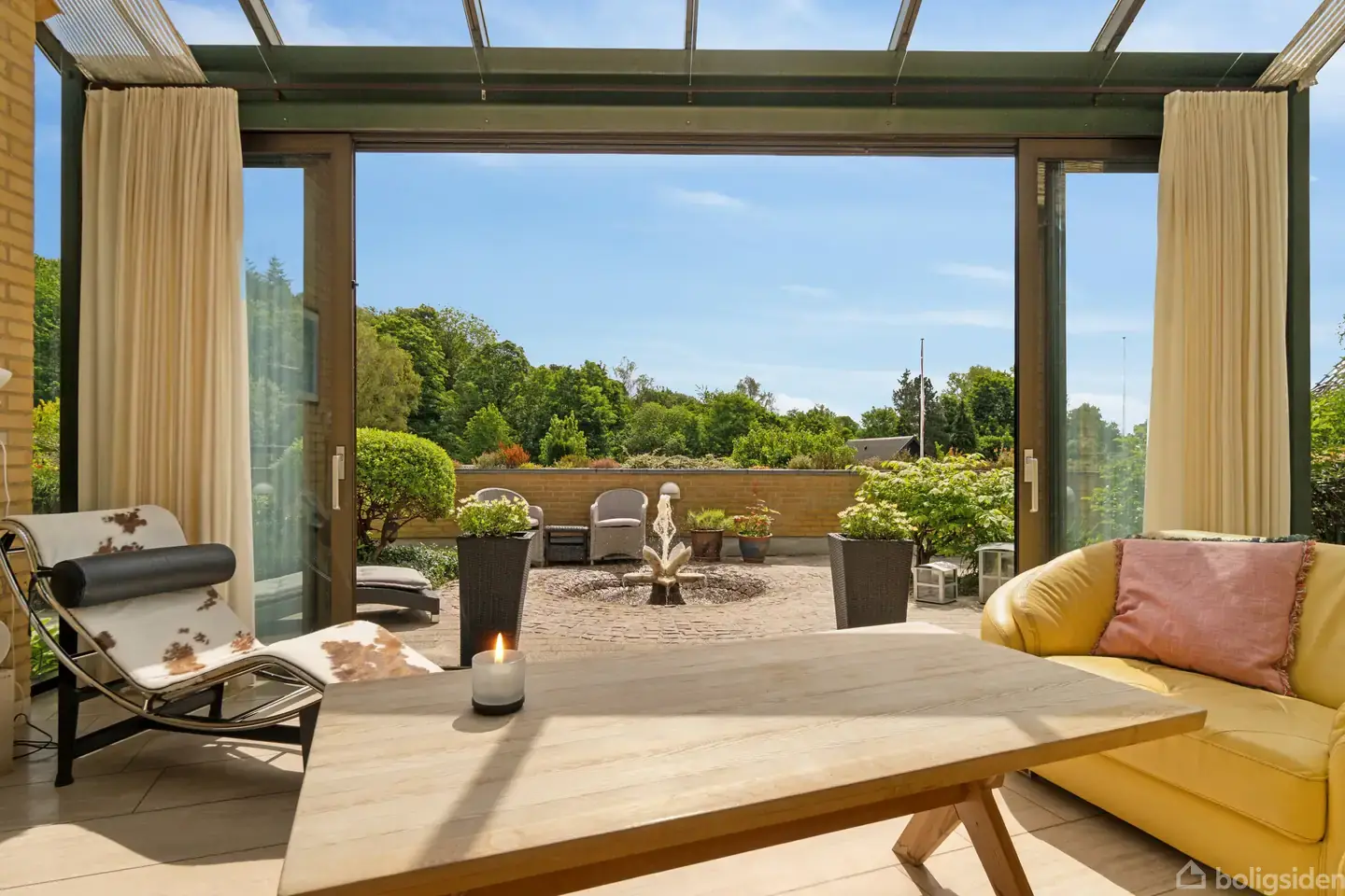 Der er taget højde for naturen på denne ejendom i den nordlige del af Brabrand. Villaen ligger omgivet af skov og grønne områder, og man får en særlig fornemmelse af, at der er højt til himlen. Midt i hjemmet har man nemlig en særlig løsning i form af det imponerende glastag, der troner over opholdsmiljøet. Her kommer naturen endnu tættere på, og man har også overvejet looket, idet glastaget fortsætter op over carporten. Samtidig er hjemmet gennemført med moderne komfort såsom gulvvarme overalt