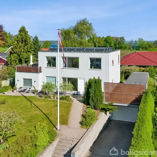 Velkommen til denne imponerende villa, der strækker sig over hele 262 kvadratmeter boligareal plus en ekstraordinær kælder på 150 kvadratmeter. Bygget i 2011, tilbyder dette hjem et moderne design kombineret med en praktisk indretning, som gør det ideelt for den store familie eller dem, der ønsker masser af plads. Huset byder på fire rummelige soveværelser, der alle nyder godt af et stort lysindfald takket være de store vinduespartier. De to elegante badeværelser er udstyret med moderne faciliteter og giver både komfort og funktionalitet til dagligdagen. Den rummelige entre leder videre til et velindrettet bryggers, hvor hverdagens gøremål kan klares let og effektivt. I stueplan og på 1. salen finder du slebne betongulve med rød granit, hvilket skaber en stilfuld og vedligeholdelsesvenlig overflade. Fra køkken-alrummet er der direkte adgang til en vestvendt terrasse, hvor du kan nyde aftensolen i fulde drag. Førstesalen byder på en spektakulær udsigt over både fjord og mark – perfekt til at slappe af efter en lang dag. Kælderen er ikke kun praktisk men også underholdende med sit værksted udstyret med bil lift samt et billardrum for hyggelige stunder med vennerne. Derudover findes her endnu et badeværelse samt viktualierum for optimal opbevaring. Udenfor venter en velanlagt have komplet med haveskur indeholdende lukket depotrum, cykelparkering samt tørreplads og lille væksthus – alt hvad man behøver for at nyde udelivet året rundt. Beliggende i et roligt kvarter har du nem adgang til både naturen ved Trelde Næs mod øst og Randsfjord mod vest. Området omkring ejendommen er ideelt for familier; børnehave og skole ligger blot 1,2 km væk ad sikre cykelstier næsten hele vejen dertil. Indkøbsmuligheder findes indenfor kort afstand på 2,2 km mens gymnasiet ligger kun 6,6 km fra døren – alt sammen let nås via bybussen som stopper lige foran huset eller cykelstien indtil Fredericia centrum.