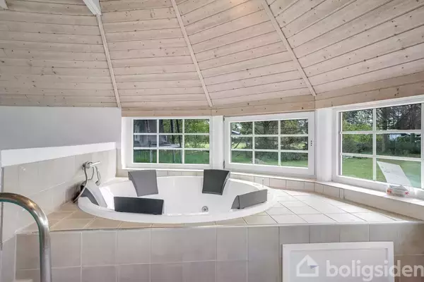 Stort og velholdt pool-sommerhus med stråtag, beliggende på en skøn stor grund i meget fredelige omgivelser på Bøtø nær stort naturområde/"Fuglereservatet "og Bøtø skoven.Huset er indrettet med 4 afdelinger:Pool område med pool og spa-afdeling samt badeværelse m. toilet, bruseniche, vask, skabsplads og sauna.2 værelsesafdelinger med 3 gode soveværelser og 1 badeværelse i hver afdeling - Badeværelserne fremstår pæne og velholdte med toilet bruseniche, skabsplads og vask.Hjertet i huset har vi køk