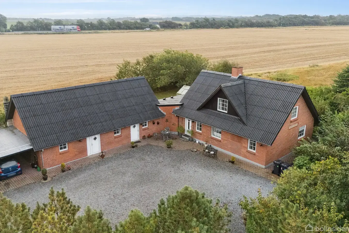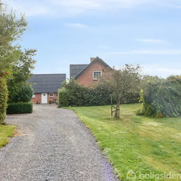 Velkommen til en klassisk ejendom med et roligt landligt islæt og en varm, indbydende atmosfære fra første skridt ind på matriklen. I ankommer ad en flot allé og møder en åben gårdsplads mellem hovedhuset og de røde udbygninger, mens markerne strækker sig som en grøn baggrund og giver en følelse af privatliv og udsyn. Det varme lys strømmer ind gennem de store vinduespartier, og den dejlige udestue i kvalitetsmaterialer åbner hjemmet op mod haven og terrassen — et naturligt sted morgen, middag o