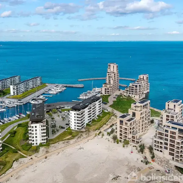 Udsigt til Øresund, 3 store altaner, elevator og egen p-plads i parkeringskælder Sublim liebhaverlejlighed beliggende øverst oppe og med dobbelt lofthøjde i køkken og spisestue samt udgang til tre store balkoner på 21, 19 og 16 m2 og den smukkeste udsigt over Øresund. Detaljerne er mange og materialerne er smagfulde og i høj kvalitet. Det store uno form køkken/alrum med dobbelt lofthøjde, masterbedroom med skydedøre til egen balkon mod Øresund og som den eneste lejlighed byder den også på et meg