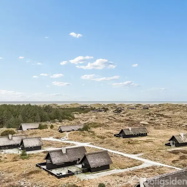 SMUKT FRITIDSHUS I ET FREDET OG ENESTÅENDE SOMMERHUSOMRÅDE · Stråtækt ferieoase på stor naturgrund · Fleksibel indretning med to separate huse · Lys indretning med sjæl, charme og lofter til kip · Placeret i Ferbæk Fredningens smukke natur · Gennem klitterne til fods mod Vesterhavet Det er hede, lyng, klitter, marehalm og nåleskov, der alt sammen folder sig ud mod den brede, hvide sandstrand og Vesterhavets brusen – ja, det er storslået natur, der byder jer velkommen, når I fremover skal ferier