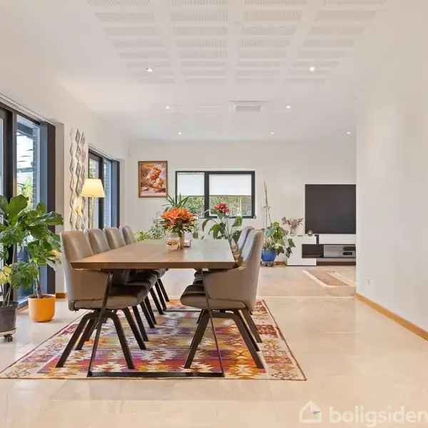 220 kvadratmeter tager form som generøse rammer til små stemmer og voksende liv – et moderne hjem fra 2020, skabt til familielivet og måske endda til flere generationer. Valmtaget løfter sig i mørke linjer over de flotte mursten, mens sorte vinduer og den solide hoveddør markerer en arkitektur, der favner både nutid og nærvær. Her får familielivet lov at fylde, brede sig, udvikle sig – uden at skulle gå på kompromis med plads, funktion eller hverdagsflow. Eriksmindekvarteret hviler på et stykke lokalhistorie, der begyndte som bar mark og hurtigt voksede til et af Greves mest børnevenlige områder. Dengang mødtes landmænd, familier og drømme i stalden på Eriksminde, og herfra tog kvarteret form — et sted skabt af fællesskab, hjælpsomhed og troen på et godt liv. Den ånd mærkes stadig i dag, hvor stisystemerne binder kvarteret sammen, legepladserne summer af liv, og grønne lommer giver plads til både eventyr og hverdag. Haven rundt om huset følger samme fornemmelse af åbenhed og frihed: en stor overdækket terrasse til grillglød og lange snakke, solsenge i læ for brisen, græs til boldspil og kongespil, et udhus til cyklerne og en forhave, der byder velkommen uden at kræve opmærksomhed. Det er en grund, der inviterer til liv, fest, børn på vej ud ad døren og stille øjeblikke i skyggen. Lofthøjden på 266 cm mærkes som et stille løft gennem hele boligen – en fornemmelse af luft, lys og generøsitet, der klæder de nærmest nye materialer og den moderne planløsning. Her folder livet sig ud i flere retninger: en forældreafdeling med eget badeværelse og ro omkring døren, og en separat værelsesfløj med fire gode værelser, hvoraf ét har direkte adgang til et af de to badeværelser – en sjælden luksus, der giver plads til både de små stemmer, de store skridt, lektier, søvn og gæster. Madlivet folder sig ud omkring det lækre HTH-køkken i mørkt træ, hvor vitrineskabene gløder let og bordpladen ligger klar til både hverdagsretter og de store anledninger. Herfra glider rummene naturligt videre — alrum og stue åbner sig mod terrassen gennem brede vinduer, og akustiklofterne giver varme og karakter. Til den ene side plads til lange middage, til den anden en dagligstue, hvor man kan trække vejret dybt og finde ro efter dagen. Et gæstetoilet fuldender funktionaliteten. Varmepumpe, ventilation, aircondition og solceller arbejder stille i baggrunden og giver huset et rart, stabilt indeklima – en energirigtig helhed, der mærkes som fremtidssans i dagligdagen. Man mærker hurtigt, hvordan mavefornemmelsen finder ro i de generøse rammer og pladsen til alt, der følger med et voksende liv.