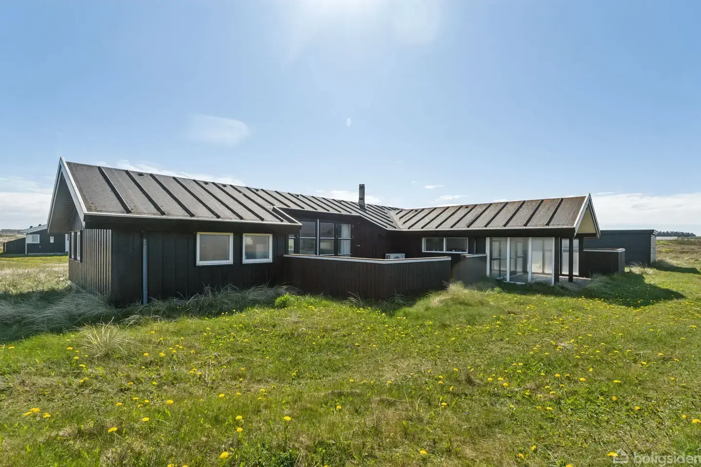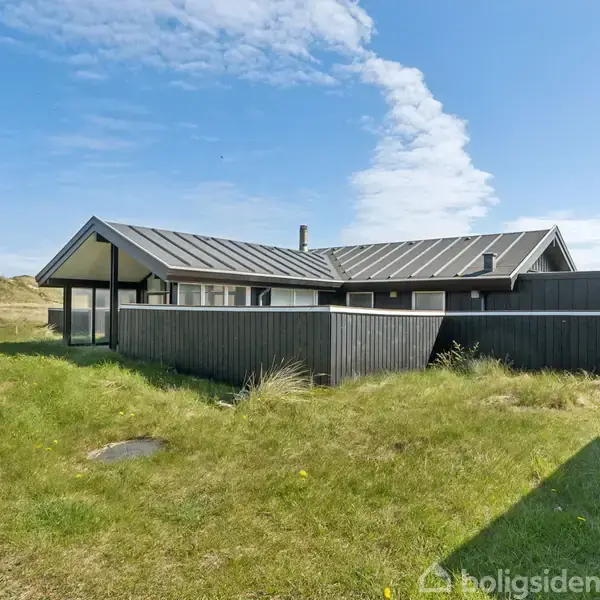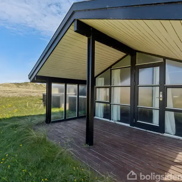 Her er både læ, ro og marehalm. Ejendommen ligger op til fredet område. Beliggenhed: Lige bag den yderste klitrække i det bølgende landskab ved Nørlev Strand, lidt nord for Skallerup Klit med et af Danmarks mest populære feriecentre ligger Udemarken som en blind vej. Grunden: Den 2.500 m2 store grund ligger hen som naturgrund med marehalm og græs. Udlejning: Huset har aldrig været udlejet, men har et udlejningspotentiale på ca. kr. 150.000,00. Boligen: Det 120 m2 store træhus er bygget i 1-på-2 med sortmalede brædder, tagpap samt hvide vinduer og dørrammer. Ejendommen er renoveret over de seneste otte år. Her er flere terrasser, hvoraf den ene på 25 m2 er overdækket. Ejendommen fremstår flot og nymalet overalt. Der er varmepumpe, brændeovn og elradiatorer. Indvendigt er der klinker i køkken og på badeværelserne, medens der i de øvrige rum er væg til væg tæpper. Der er nyere køkken og badeværelser. Køkkenet er med alle nødvendige hvidevarer og fremstår lyst og indbydende. I direkte forbindelse med køkkenet findes en spisestue. Endvidere er der en stor, lys opholdsstue. Der er fire store soverum med i alt 8 sengepladser samt et mindre kontor. Det ene badeværelse har spa/badekar, medens det andet har bruser.