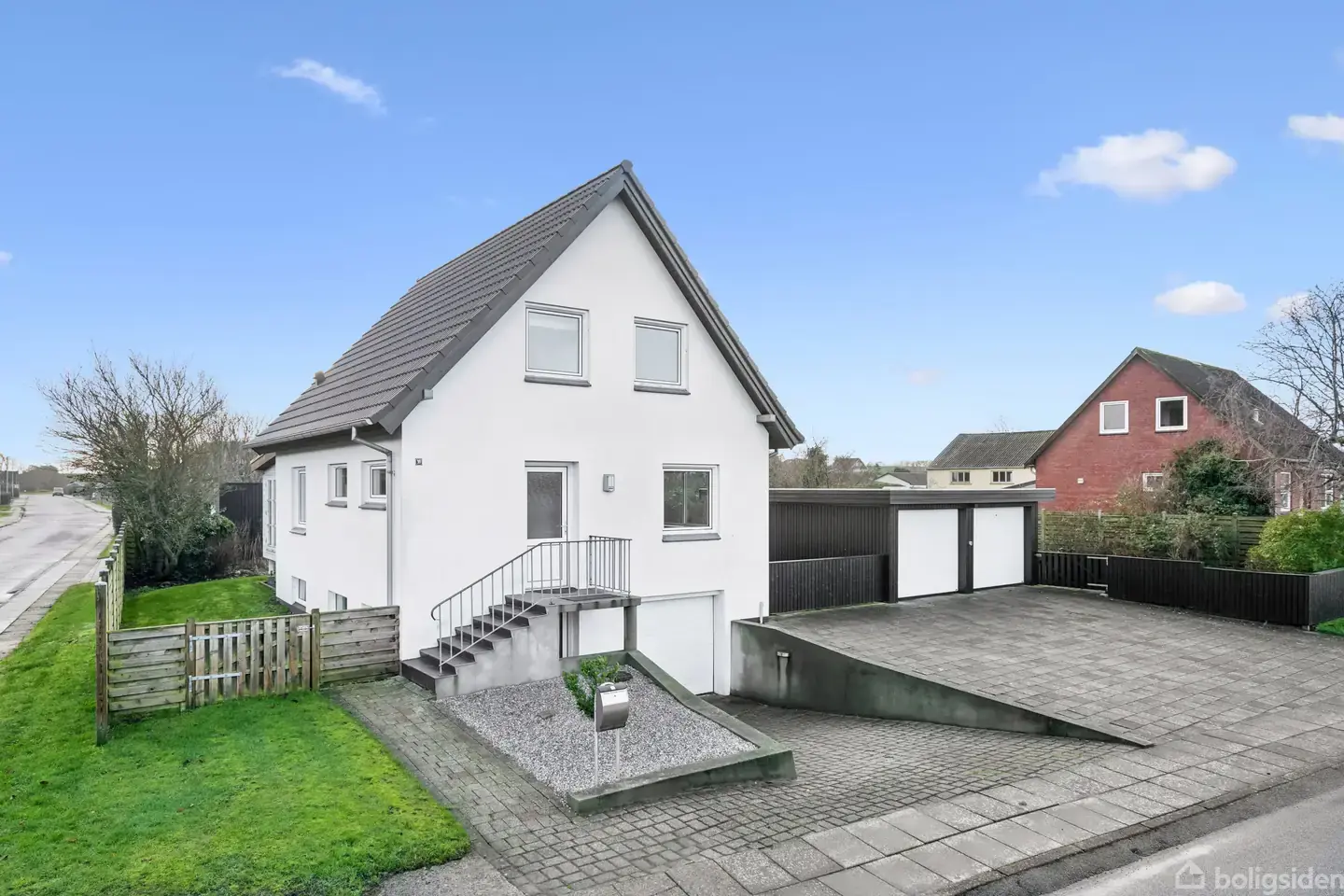 Denne velholdte villa fra 1955 rummer 121 m² boligareal samt 67 m² kælder og ligger på en 1.229 m² grund med god plads til ude- og indendørsliv.Ejendommen fremstår indflytningsklar og har en attraktiv planløsning for familien, der ønsker funktionalitet kombineret med lys og luft. Den moderne facade og indgangsparti giver et indbydende førstehåndsindtryk, mens to rummelige garager – opført i 2009 og 2021 – sikrer gode parkerings- og opbevaringsmuligheder.Indretningen byder på to værelser på 1. sa