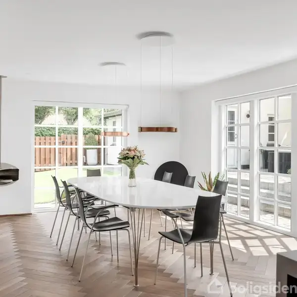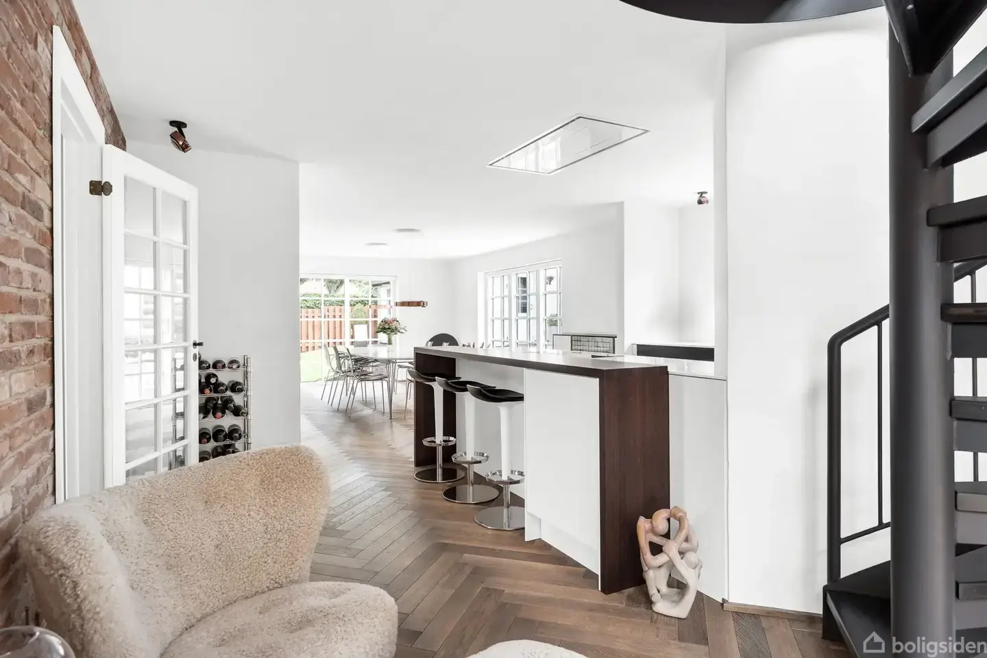 Enestående ejendom med ejerlejlighedsstatus – beliggende i skjult oase midt i Hørsholm Denne fuldstændig gennemrenoverede bolig gemmer sig langt væk fra vejen og fremstår som en fredelig og ugeneret oase i hjertet af Hørsholm. Ejendommen har status som ejerlejlighed, men opleves som en selvstændig villa – beliggende i ægte idyl for enden af en lang indkørsel. Her forenes arkitektonisk elegance med moderne komfort og gennemtænkte løsninger, så du får et hjem, der ikke blot er smukt, men også bygget til at holde. Boligen er totalmoderniseret fra inderst til yderst med kompromisløs sans for kvalitet. Køkken, bryggers og badeværelse er indrettet med Uno form-elementer og udstyret med integrerede hvidevarer i topklasse fra Gaggenau, Liebherr og Bosch. Her er naturligvis også installeret Quooker – ikke blot den almindelige version, men modellen med straks kogende vand, koldt vand og danskvand via den nyeste CUBE-løsning. Hele huset har nye sildebensgulve fra Trækompagniet pånær overetagen, hvor der er Parador. Samtlige skabe og skuffer er udstyret med soft-close. Alt, der overhovedet kan styres digitalt, er integreret og kan betjenes via mobil eller tablet, som medfølger ved køb. Det store opholdsrum i underetagen er uden tvivl boligens hjerte. Her er en autentisk murstensvæg, der tilfører karakter og varme, kombineret med et indbydende loungeområde, rummeligt alrum og et køkkenmiljø, der indbyder til både hverdag og gæstfrihed. Kombinationen af rå charme og eksklusiv æstetik gør rummet til et af husets absolut mest unikke. Haven er lige så gennemtænkt som huset. Den er velanlagt og ugeneret – passet professionelt de seneste tre år af DM Greenkeeping – og afskærmet mod både naboer og Usserød Kongevej af et nyt støjdæmpende hegn. Også mod naboen i UK84 er der opsat nyt hegn, som sikrer fuld afskærmning og privatliv. En fjernbetjent port fører ind til den lukkede garage, og på grunden finder du også et anneks med mulighed for ekstra værelse eller opmagasinering – ikke godkendt til beboelse, men ideel som gæsteplads eller hobbyrum. Alle yderdøre i hovedhuset er udskiftet som del af renoveringen, ligesom den ene dør i annekset. Ejendommen er samtidig energimæssigt optimeret med ny fjernvarmeinstallation og gennemstrømningsvandvarmer, og underetagen har behagelig gulvvarme. Vinduerne er Velfac træ/alu, og huset er opført med dobbeltmurede yder- og indervægge – et kvalitetsniveau, som man sjældent ser i området. Selvom adressen formelt er Usserød Kongevej 82B, ligger boligen så tilbagetrukket og diskret, at den snarere hører hjemme på Birkevej eller i Rønnebærdalen. Du mærker ikke noget til trafikken – kun stilheden og det grønne omkring dig – og alligevel er du midt i byen. What’s not to like?