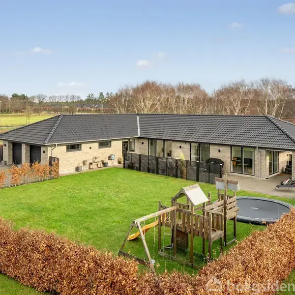 Åbent hus med tilmeldingskrav 5/2 - klik på billede - Er du på udkig efter det perfekte sted for dine børn at vokse op? Så kan du godt sætte denne villa øverst på ønskelisten. Villaen ligger i en lukket lomme i et børnevenligt kvarter i det nordligste Varde - direkte ud grønne arealer og åbne marker - og samtidig tæt på institutioner og skole. Villaen er opført i 2020, den er fuldstændig indflytningsklar og har en superfunktionel indretning med hele fem soveværelser og flotte, lyse opholdsrum med masser af udgange til haven. En stor dobbelt garage er integreret i bygningen, der i øvrigt byder på imponerende 236 m2 i alt. Fra garagen er der direkte adgang til beboelsen. Indenfor giver det tidløse materialevalg et gennemført moderne udtryk, og samtidig er det slidstærke materialer, som holder til familielivet med fx børn, hunde og legetøjsbiler. Lofterne er udstyret med akustikfelter, som holder lydniveauet behageligt. Den samme rolige, minimalistiske designlinje går igen i interiøret fra det kombinerede entré og bryggers-rum over husets to badeværelser og til køkkenet, der ligger som en integreret del af det store opholdsmiljø. En anden fin detalje finder vi også i bryggers/entreen - nemlig et stort opbevaringsskab med skydelåger, der både kan skjule en vaskesøjle og overtøjet. Boligens store lyse opholdsrum er delt i to af en dobbelt glasdør, og værelserne er placeret i afdelinger til voksne og børn. Sagt på en anden måde byder huset på forskellige zoner som både kan åbnes op, så man kan være mange sammen og fylde huset med liv og gæster - eller lukkes af, så man kan være for sig selv og nyde stilheden. Haven er der i alt fem udgange til fra hhv. stuen, køkkenet og et af soveværelserne. Herude har man holdt vedligeholdelsesniveauet på et minimum, så man i stedet kan nyde solen og udelivet på afslappende vis. Rundt om huset er der lagt fliser, der breder sig ud til terrasser flere steder, hvoraf en er overdækket. Haven byder også på nedgravet trampolin og legetårn med rutsjebane og gynge. Områdets fredelige villaveje er forbundet af trygge stier, som blandt andet fører til Børnehaven Smørhullet og Frelloskolen. Der bor mange børnefamilier i området, så ungerne får nemt ved at finde nye legekammerater, når I flytter hertil. Du skylder dig selv og din familie at opleve dette hus indefra - I vil ikke fortryde det. Ring til EDC Varde allerede i dag, og bestil en fremvisning.