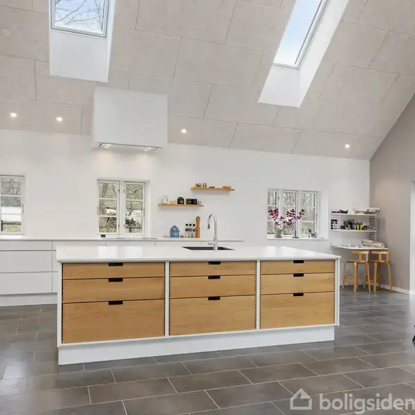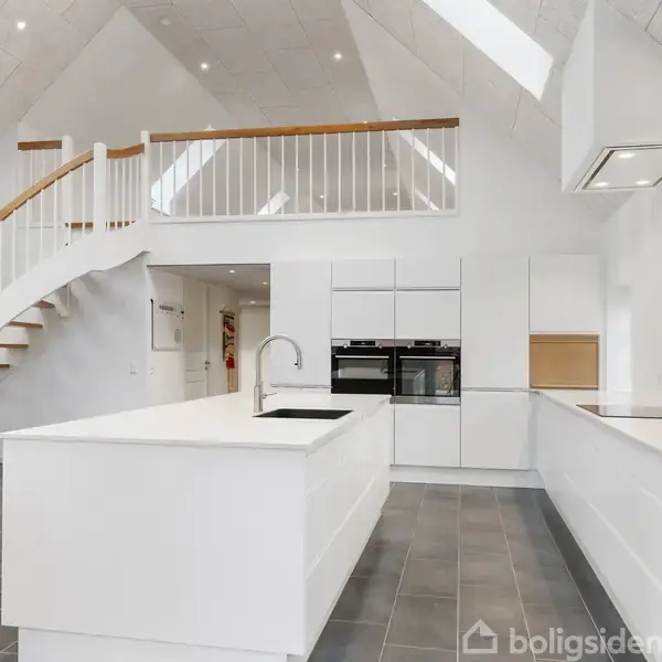 Her får I en villa på 225 m2 fra 1930, nyrenoveret og indflytningsklar på en grund på 1.603 m2. Facaden er hvid med sort tag, og huset præsenterer sig med en elegant hovedbygning og en stor carport. Det første indtryk er luft og plads omkring boligen — en markant, velholdt ejendom hvor både udearealer og beboelse er tænkt til en aktiv hverdag og roligere stunder. Indvendigt mødes I af en åben planløsning omkring et stort køkkenalrum med en markant loftshøjde og synlige ovenlys, som lader dagsly