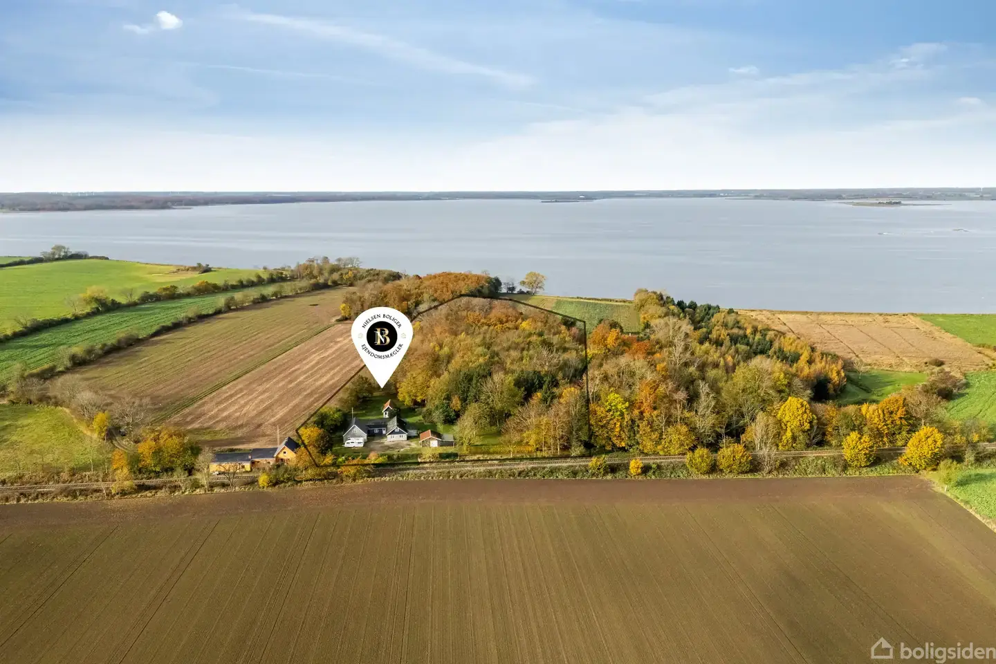 Eventyret starter på Vesterrisvej 1, 4873 Væggerløse..Velkommen til en skjult perle med en beliggenhed, der tager pusten fra de fleste. Her får du en helt unik udsigt over marker, skov og fjordvand – et sted, hvor ro, privatliv og natur smelter sammen.Ejendommen ligger tilbagetrukket for enden af en lukket stikvej, langt fra asfalt og støj, med 14.390 m² grund inklusiv egen skov. Det er et sjældent fund, hvor man virkelig kan trække vejret og nyde friheden.Hovedhuset fra 1870 er løbende modernis