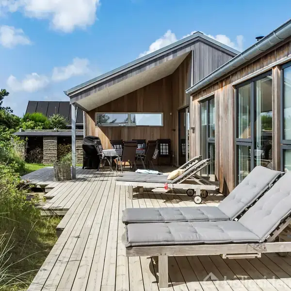 Dette elegante sommerhus fra 2020 ligger skønt placeret i Blokhus med kig til klitterne og Vesterhavet og byder på moderne komfort i smukke, vestjyske omgivelser. Huset fremstår enkelt og indbydende med træfacade i Canadisk Cedertræ og store vinduespartier, der sikrer et fantastisk lysindfald og flot udsigt over byen mod klitterne. De tre af fire soveværelser har alle direkte udgang til terrassen, så dagen nemt kan starte med frisk havluft. Indendørs er der kræset for detaljerne med et stort, lyst opholdsrum, der samler køkken, spiseplads og stue. Her finder I brændeovn, gulvvarme (via jordvarmeanlæg), og et veludstyret køkken - ideelt til hyggelige feriestunder året rundt. Wellnessoplevelsen er noget helt særligt: Fra det største badeværelse er der direkte adgang til sauna og udebruser (der kan benyttes året rundt), så I kan bevæge jer fra badekar til udeliv i rene spa-rammer. Udendørs kan livet nydes på husets mange terrasser, som byder på både overdækkede og åbne arealer. Her er der plads til sol, skygge og lange aftener med grill og bål. Beliggenheden er ideel med kun ca. 900 meter til Vesterhavet og kort gåafstand til Blokhus bymidte med caféer, butikker og feriestemning. Området byder desuden på naturoplevelser i Blokhus Klitplantage, aktiviteter ved Gateway Blokhus og sjove udflugter til Fårup Sommerland.