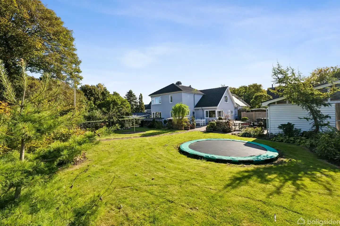 Grunden folder sig ud med terrassemiljøer til tre sider og blødt græs, der fortsætter helt ud til det levende hegn. Stier bugter sig ind og ud mellem solpletterne, og midt i det hele står den store, flotte villa. Villaen har dannet gode rammer om børnefamiliers hverdage, og nu kan det blive jeres tur til at indtage de lyse stuer. Velkommen til. Ja, her er virkelig skønt på den store grund, som tilmed ligger helt ugeneret takket være afstanden til vejen. Det søde udeliv har hjemme her, og den god