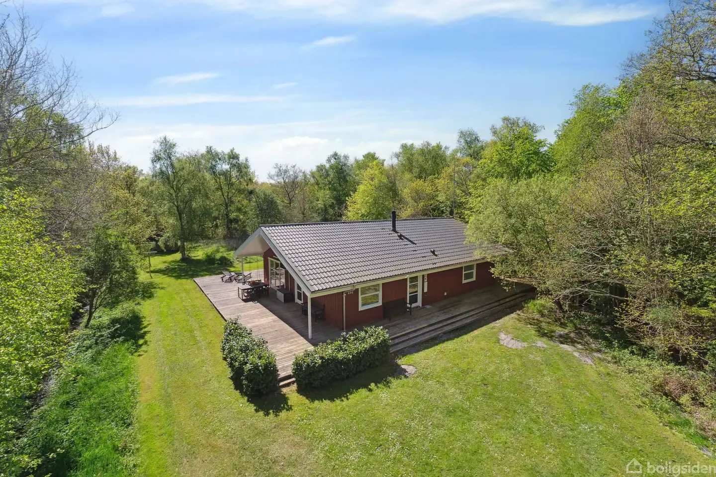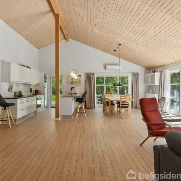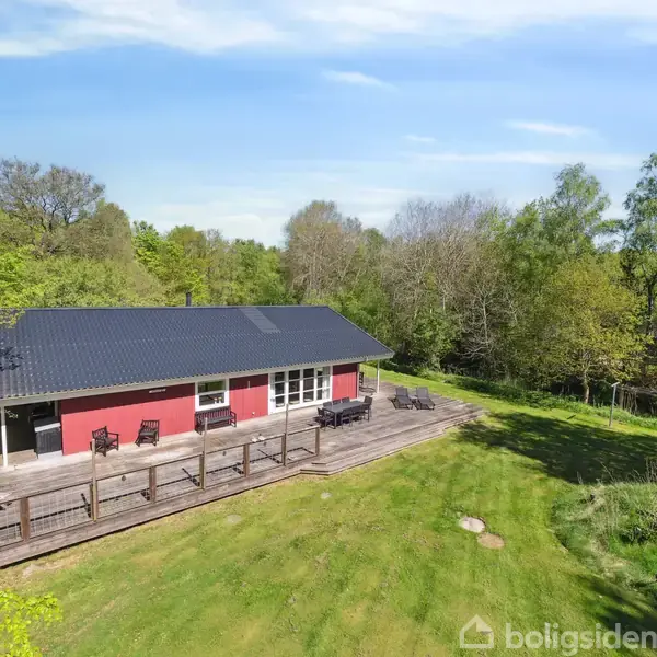 Dette indbydende fritidshus fra 2007 rummer 144 m² veludnyttet boligareal på en 2.526 m² stor naturgrund omgivet af fred og grønne omgivelser. Den klassiske røde facade og det sorte ståltag giver huset et tidløst udtryk, hvor solidt håndværk og kvalitet er i fokus.Lys, luft og gennemtænkt indretningIndretningen er planlagt med omtanke og funktionalitet. De store vinduespartier og terrassedøre skaber et naturligt samspil mellem ude og inde og fylder boligen med dagslys.Huset rummer fire rummelige