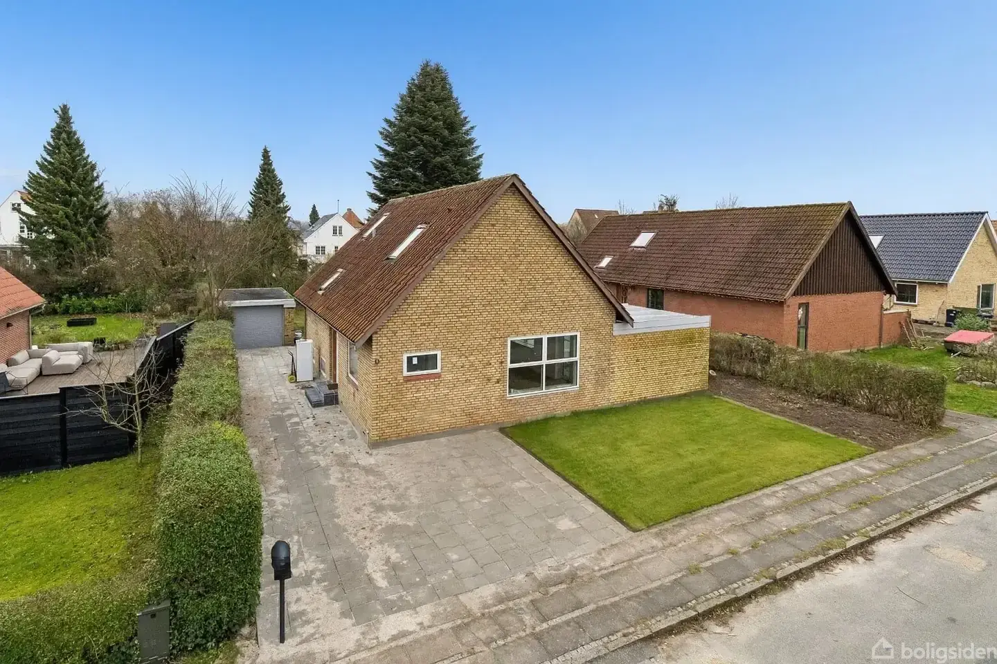 home Odense har fornøjelsen af at præsentere denne lyse og moderniserede halvanden plans villa i forskudte niveauer – en klassisk Jens P. Koch-villa, som i 2025 har gennemgået en større transformation. Resultatet er et stilfuldt og tidssvarende hjem, hvor lys, materialer og planløsning går op i en højere enhed.Niveauforskydninger og gennemtænkt planløsning Bag de gule murstensfacader bydes man velkommen i en lys og rummelig entré, hvor boligens karakteristiske forskudte etager straks viser sig.