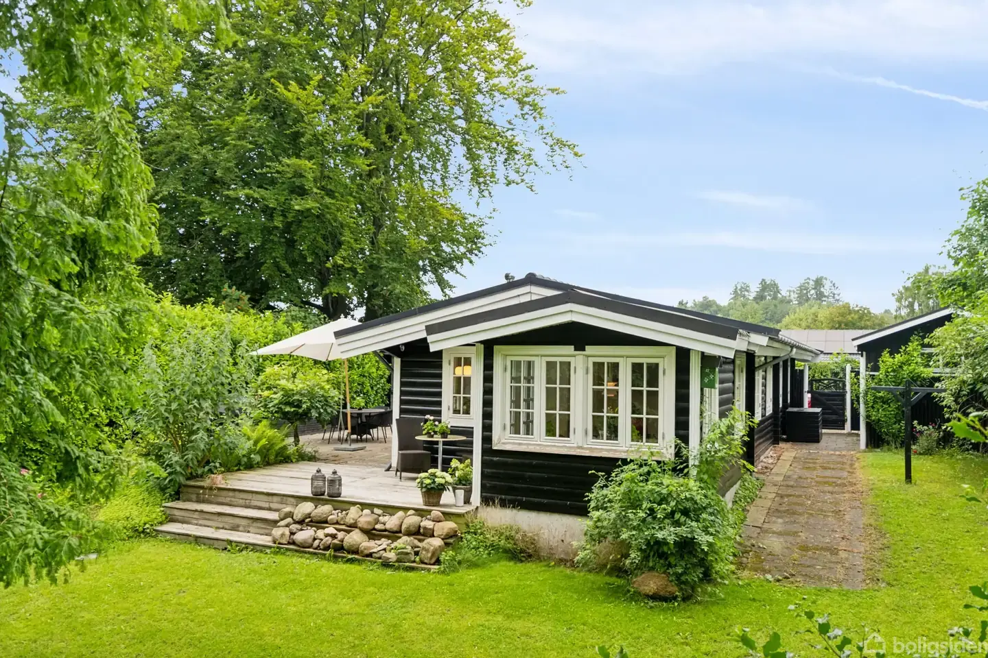 Her får du en sjælden mulighed for at blive ejer af en indflytningsklar villa i Hørsholm – et hjem, hvor boligdrømmen forenes med naturens ro og en helt særlig atmosfære. Allerede ved ankomsten mærker du stemningen, hvor det sorte bjælkehus med nymalede sprossevinduer og totalistandsat indretning skiller sig ud. Beliggenheden i den sydlige del af området betyder, at skoven nærmest omkranser grunden, og den grønne udsigt kan nydes fra de fleste rum. Indenfor bydes du velkommen af et velholdt og g