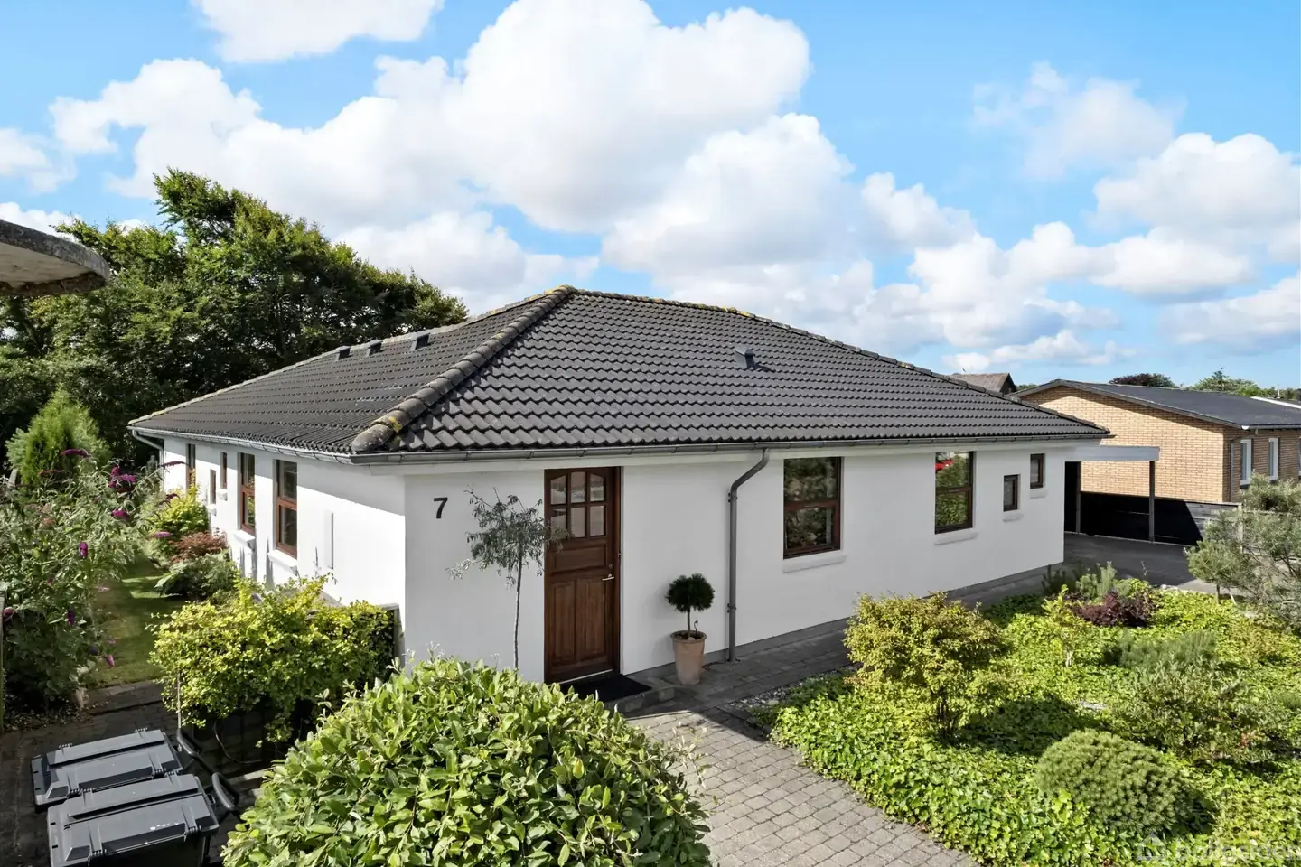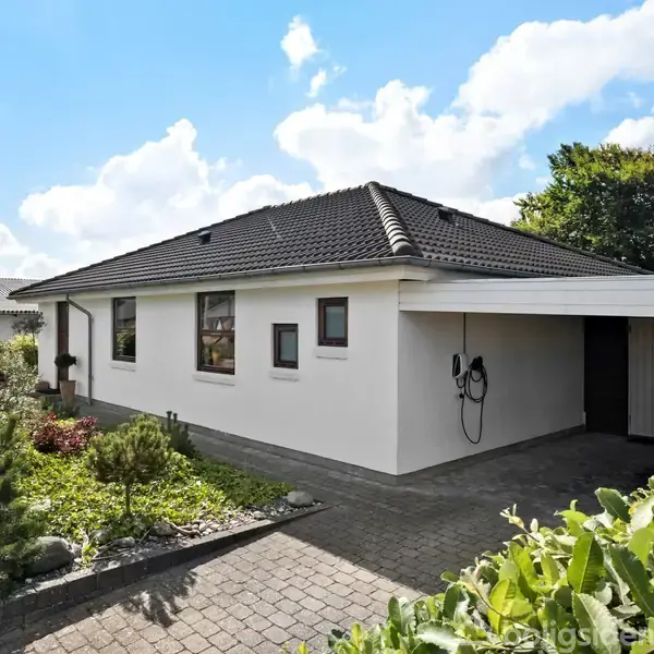 Absolut flot og velholdt 1-plans villa på 151 kvm., tilhørende 41 kvm. carport med 18 kvm. godt værkstedsrum. Beliggende på en 704 kvm. grund med stor delvis overdækket sydvendt terrasse og helt lukket have med legehus, frugttræer og mulighed for aktiviteter for store og små. Kort afstand på knap 1 km til skole, børnehave og idrætshal via cykelsti og via motorvejsforbindelsen kommer man hurtigt til både Hjørring og Ålborg. Til fritiden er der blot 2 km til skov og golfbane, ligesom der er 3 km. til Kjul Strand. Villaen er oprindelig opført i 1967 men i 2012 blev det oprindelige hus på nær ca. 9 m. ydervæg revet ned og der blev opført en helt ny moderne vinkelvilla med gulvvarme i hele boligen. Boligen opvarmes nu af nyere installeret luft til vand varmepumpe af god kvalitet der holder energiforbruget i den absolut lave ende. Villaen er fuldmuret, fremstår med hvid vandskuret facade, sort tegltag, mahogni termovinduer, træ- og klinkegulve samt hvide gipslofter. Indeholder: entré, separat bryggers, værelse (kontor eller et 3. børneværelse), stort og flot køkken-alrum med udgang til terrasse og i åben forbindelse til opholdsstue. Desuden er der separat børneafdeling med 2 gode værelser med faste skabe og badeværelse med bruseniche. Endelig er der en "voksen"-afdeling indeholdende godt soveværelse og separat badeværelse hvor der er badekar og 2 håndvaske. Villaen fremtræder overalt i særdeles velholdt stand og hvis du drømmer om at bo i en nyere opført villa hvor hverdagskomforten smelter sammen med naturoplevelser, skal denne bolig ses!