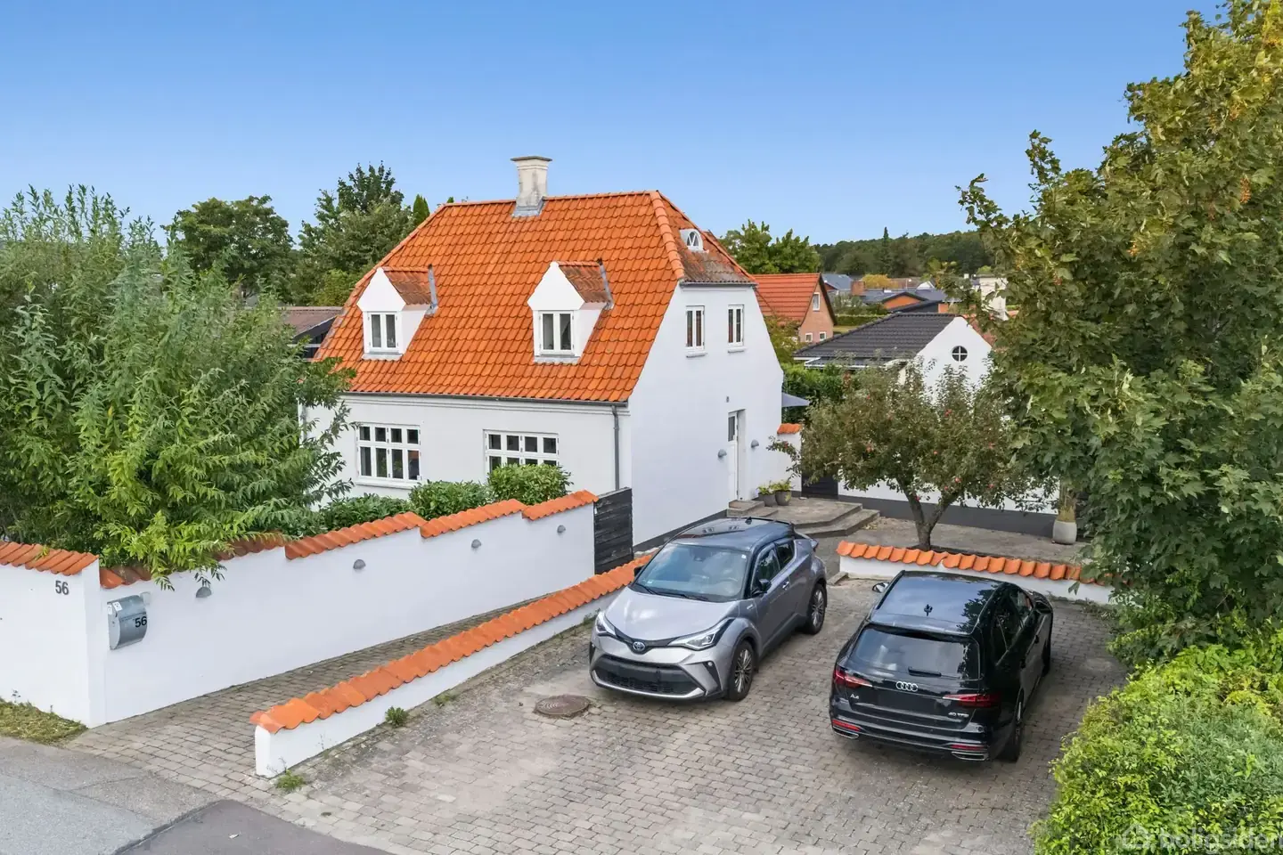 Som en klassisk Køge-villa med dannebrogsvinduer, halvvalmet tegltag og hvide facader står denne herskabelige ejendom fra 1934 som byens fineste dame – et symbol på, hvorfor Køge kaldes “byen med de røde tage”. Opført i murermestervilla-stil med nyklassicistiske detaljer, er hjemmet moderniseret nænsomt, så husets historie og sjæl stadig mærkes. Haven er en lille verden i sig selv, delt i kapitler med hver sin stemning. En solrig græsplæne til leg, skygge under æbletræet og en sydvestvendt flisebelagt gårdhave med lægivende mure og orangeri som centrum. Orangeriet er lyst og inviterer til kaffepauser og samtaler året rundt. Her er plads til grill og hygge, mens krukker med lavendel, oliven og citronmelisse fuldender atmosfæren. Annekset er isoleret med gulvvarme og følger husets stil – perfekt som kontor, gæsteafdeling eller teenagerens fristed. Foran huset er der god parkeringsplads, og fra adressen er der kort til skole, station og Køge Torv med torvedage, caféer og butikker. Indenfor møder du herskabelige proportioner med højt til loftet, fyldningsdøre og smukke trægulve. Stueplan rummer et elegant leverum med sort køkken med originale Montana-greb, langbord, sofahjørne og pilleovn. Et værelse i stueetagen giver fleksibilitet, og badeværelset er nyt med store fliser og rainshower. Førstesalen byder på synlige bjælker, loft til kip, værelser med karnapper, hems og lysindfald samt endnu et badeværelse. Denne villa fra 1934 kombinerer herskabelighed og hjemlighed med en mavefornemmelse, der straks mærkes – et sted, hvor historie, stil og hverdagsliv mødes i smuk harmoni.