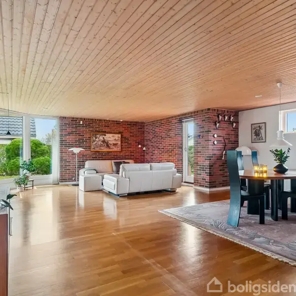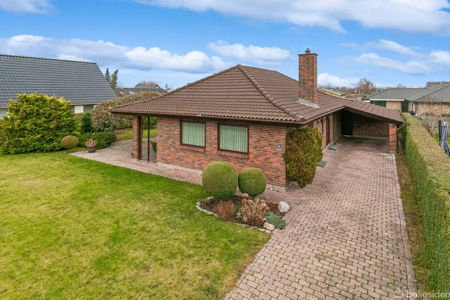 Denne villa på 127 m² placeret på en 809 m² grund byder på et roligt førstehåndsindtryk med indbydende arkitektur fra 1983, opdateret i 1996. Huset ligger fredeligt og privat med lav bebyggelse og grønne omgivelser, som giver et behageligt miljø allerede fra ankomsten via carporten og ind i entréen.Boligen er veldisponeret med tre gode værelser, samlet i to separate soveafdelinger, hvilket giver fleksibilitet til både familieliv, hobbyrum eller hjemmekontor. Badeværelset ligger centralt og frems