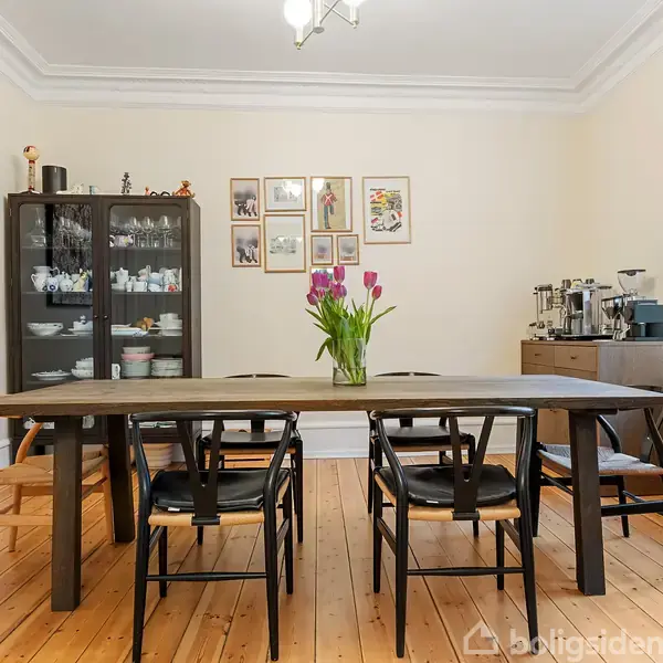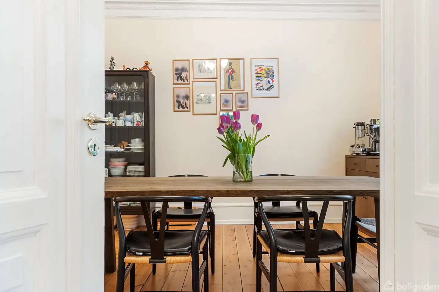 Velkommen til en velproportioneret 4V, hvor klassiske detaljer og et funktionelt hverdagsliv går hånd i hånd. Lejligheden rummer to gode soveværelser samt to stuer ensuite, der giver fleksible indretningsmuligheder til både spiseafdeling, ophold og hjemmearbejde. Den generøse loftshøjde, stuk, rosetter og fyldningsdøre skaber en gennemført, herskabelig atmosfære, som klæder den smukke ejendom og giver rummet karakter fra første skridt.Køkkenet er velfungerende med fin plads til hverdagens madlav