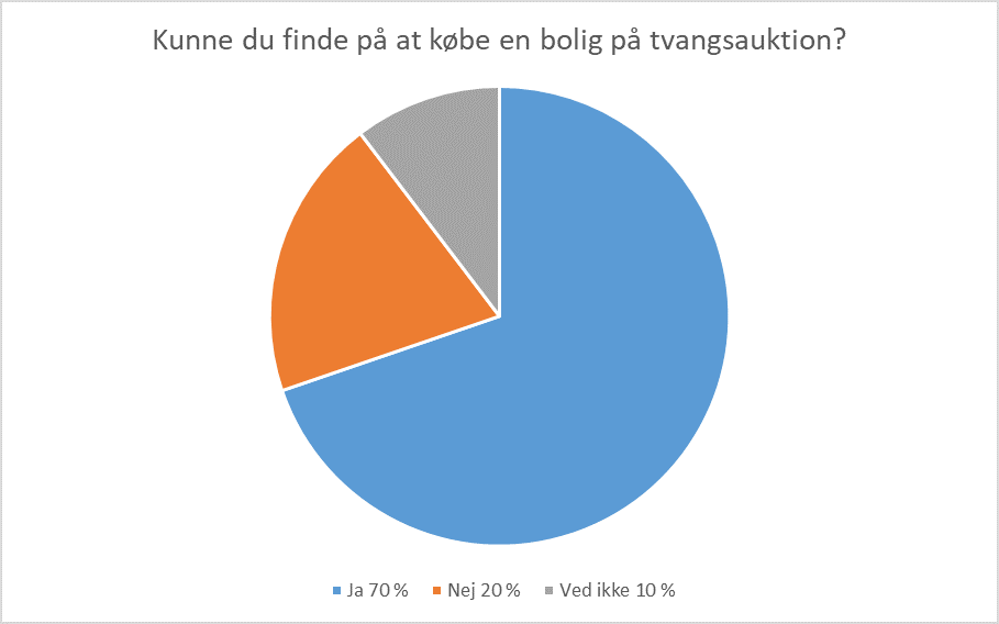 I en ny afstemning på Boligsiden svarer 70 procent af de adspurgte, at de godt kunne finde på at købe en bolig på tvangsauktion. 20 procent svarer nej til samme spørgsmål, imens 10 procent svarer ”ved ikke”.