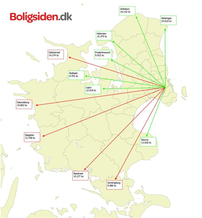 Helsingør er den ubetinget dyreste kommune med en pris på 24.610 kroner for en enkelt kvadratmeter sommerhus. Dernæst følger kommunerne Gribskov og Halsnæs med kvadratmeterpriser på henholdsvis 19.142 kroner og 15.379 kroner.